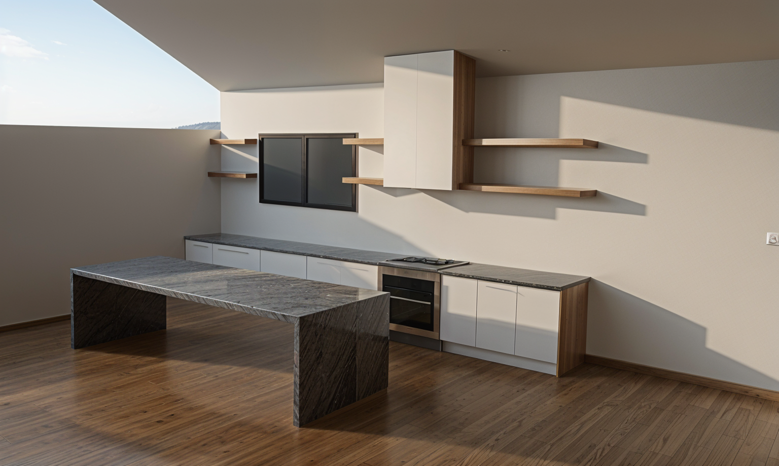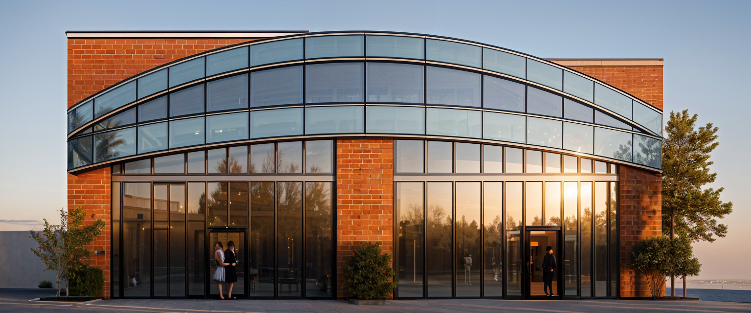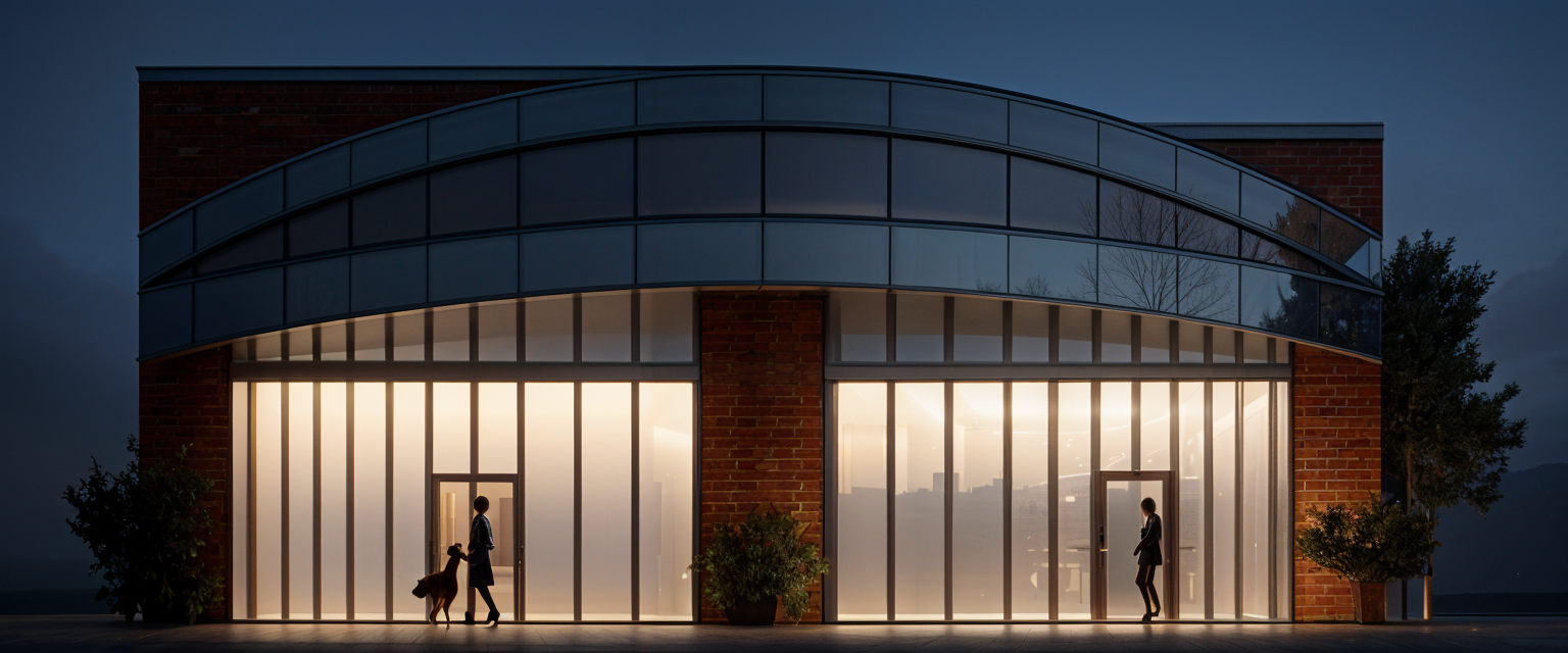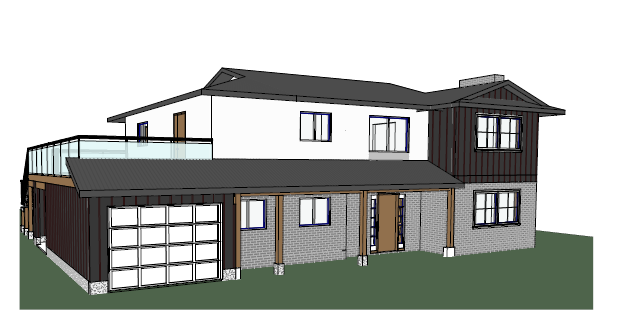make look realistic use natural lighting make day time add landscaping with plants shrubs flowers and surrounding trees asphalt shingle roof the brick is grey the upper floor is a very light grey stucco the door on the left of the building is a white garage door