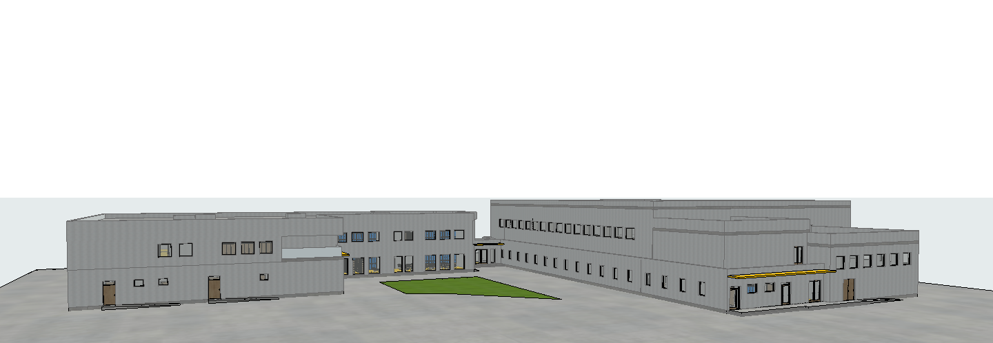 photorealistic render of a modern school building keep the existing 3d model exactly as it is with no changes to the geometry structure or proportions contemporary architectural style with a facade color combination of white grey and yellow anthracite window and door frames clean modern detailing and realistic materials the school is surrounded by greenery with trees and landscaped areas a moderate number of children walking and interacting around the school creating a natural school atmosphere subtle urban outdoor furniture such as benches pathways and bicycle racks daytime scene with soft natural light realistic shadows blue sky highly detailed photorealistic architectural visualization professional render ultra realistic high resolution