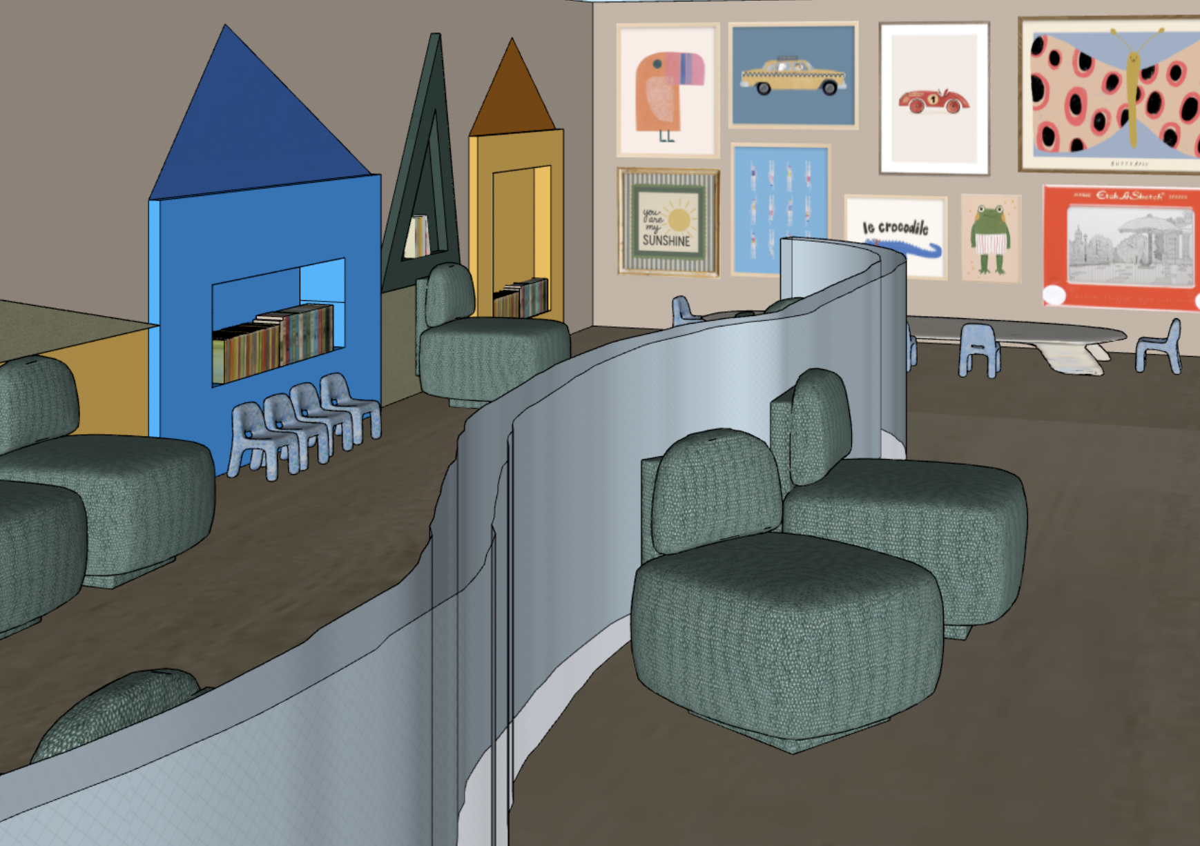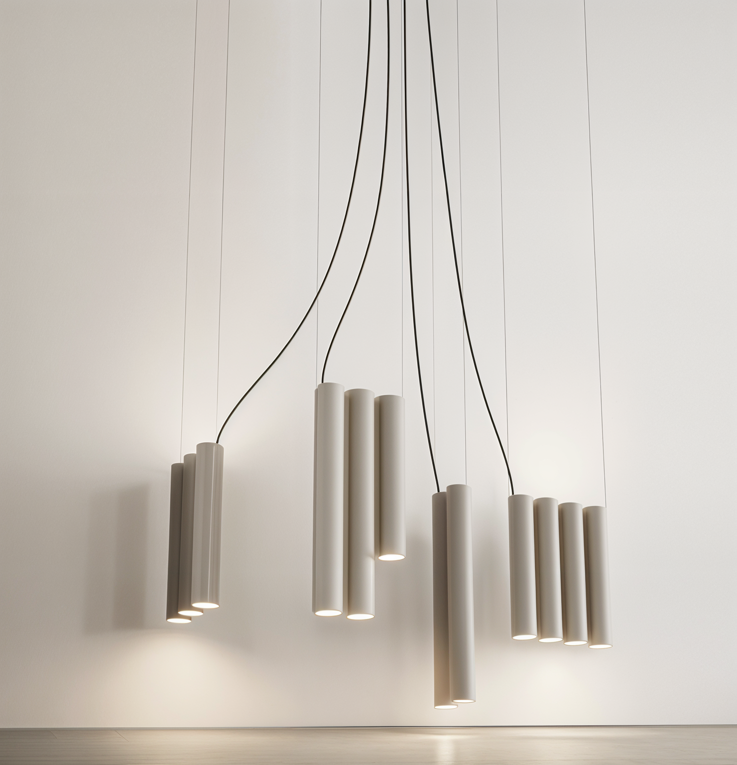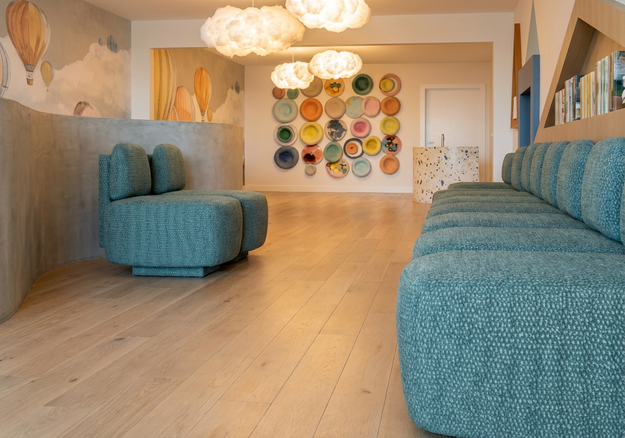 add ceiling and pendants that look like clouds bright lighting white oak floors