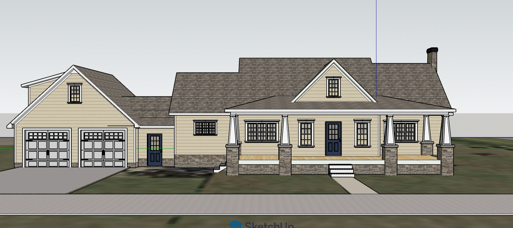 a charming craftsman farmhouse with a beige facade and grey shingle roof the house features white trim around the windows and doors with dark blue doors to create a contrast the garage has matching white doors with small window panels at the top the porch is supported by white columns with stone bases and the steps are light grey surrounding the house imagine lush green grass and a clear blue sky with soft clouds giving a serene and welcoming atmosphere