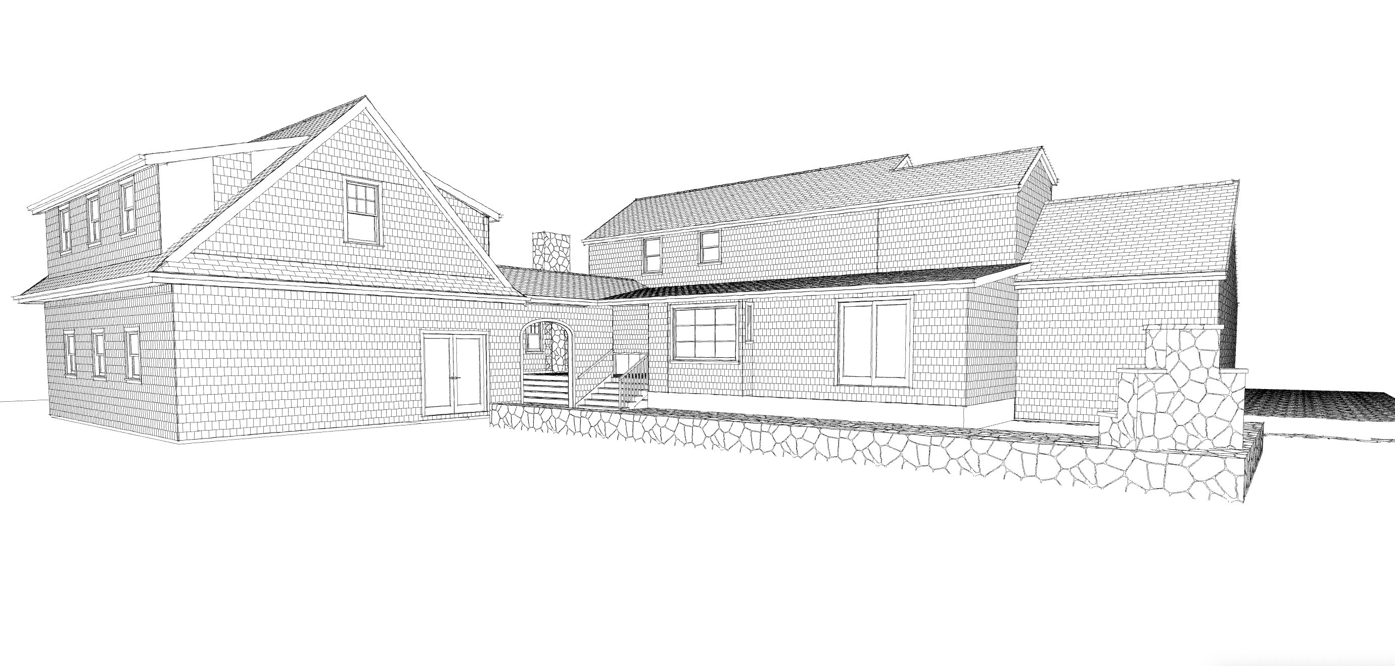 white cedar shake coastal house stone seating wall patio and outdoor grill street and trees in background
