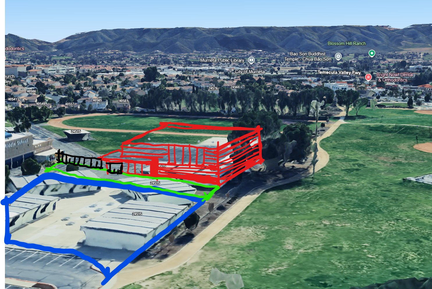 exterior shot want add a new gym building per the red lines new plaza per the green lines new parking lot in the blue boundary remove portables
