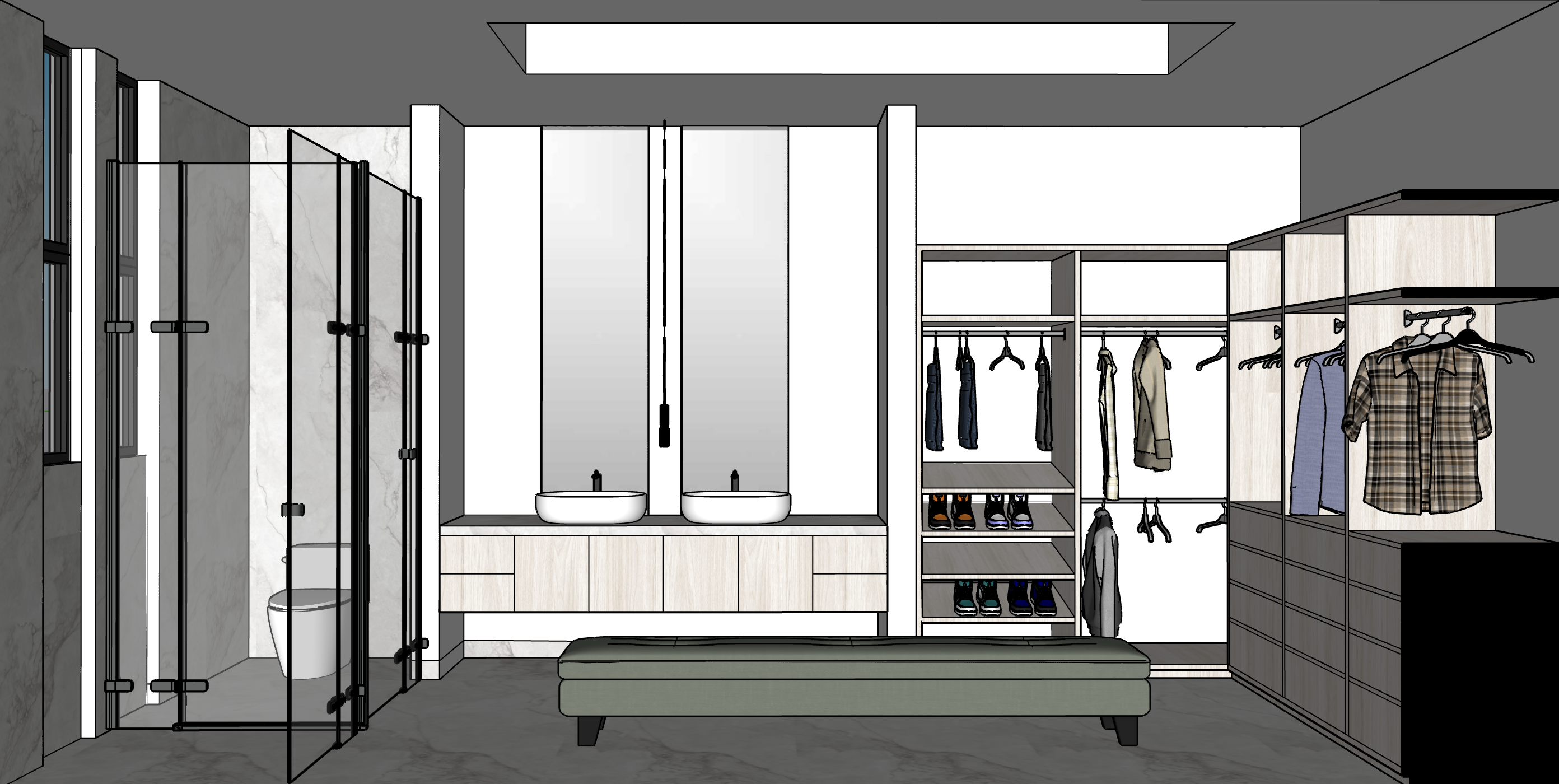modern master bathroom and walk in closet interior render contemporary minimalist design with soft neutral palette light oak cabinetry matte black fixtures and marble wall finishes only on the shower and toilet area the rest of the wall is matte white paint double vanity with vessel sinks and large vertical mirrors glass enclosed shower and toilet area on the left open wardrobe with hanging boys clothes shoe shelves and drawers on the right and an upholstered green bench in the center natural light from ceiling skylight soft reflections realistic materials clean lines and a photorealistic architectural rendering style