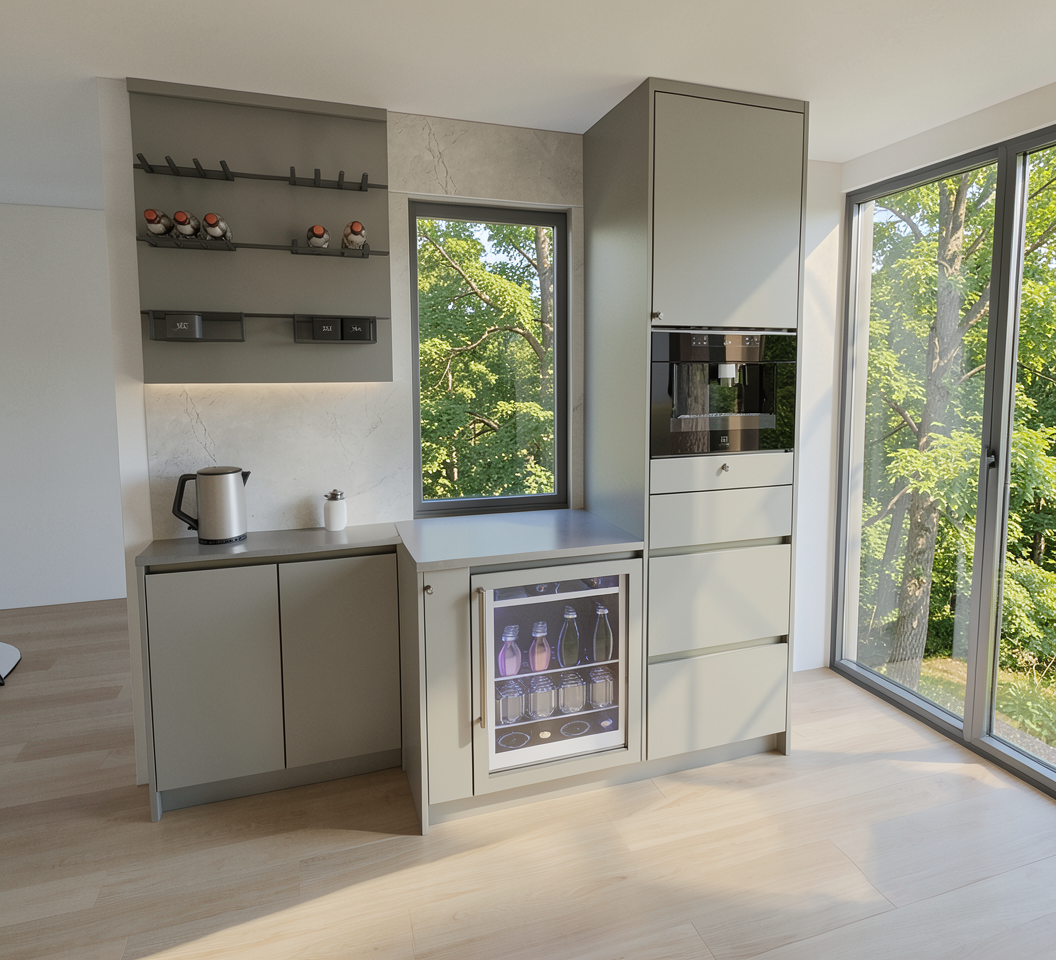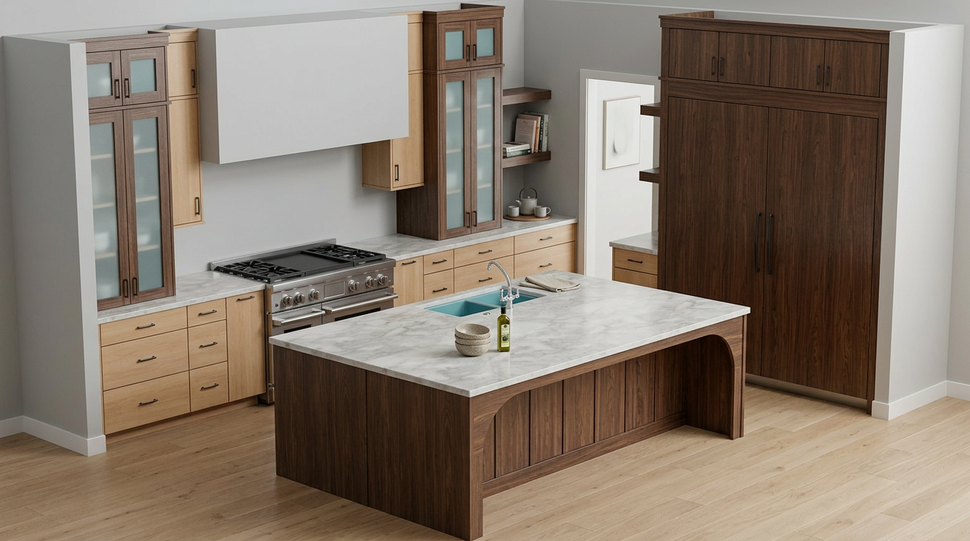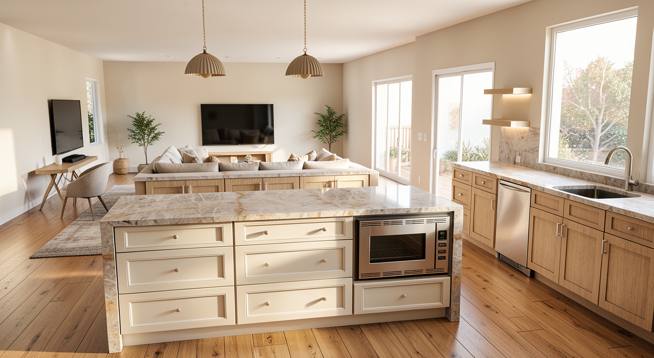 luxury modern kitchen ultra realistic rendering do not change the original layout or design open concept kitchen facing a family room the family room has a tv station mounted on the main wall no fireplace large central island with waterfall quartz countertop high end cabinetry flat panel or slim shaker soft neutral color palette warm white light oak beige tones integrated appliances under cabinet lighting statement pendant lights above island wide plank hardwood flooring kitchen opens directly to family room seating area with modern sofa coffee table large area rug clean lines elegant styling natural daylight large windows soft shadows photorealistic materials high detail architectural photography style 4k realism no structural changes keep original design proportions and layout