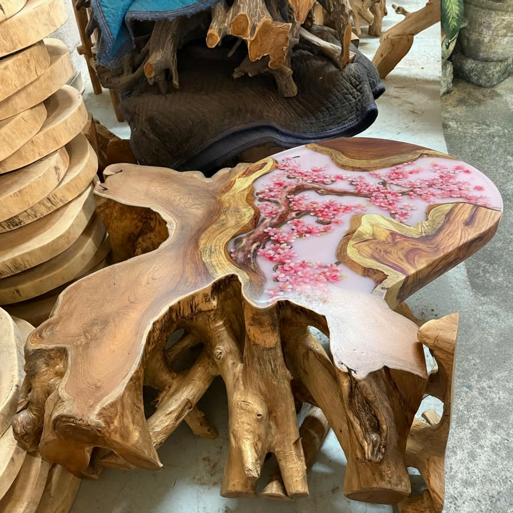 complete this wood table to create a solid shape like the ref image with resin and cherry blossom flowers do not change the shape of the wood in the original picture i need to make it look like the wood is embeded in the resin with a defined shape of the oval