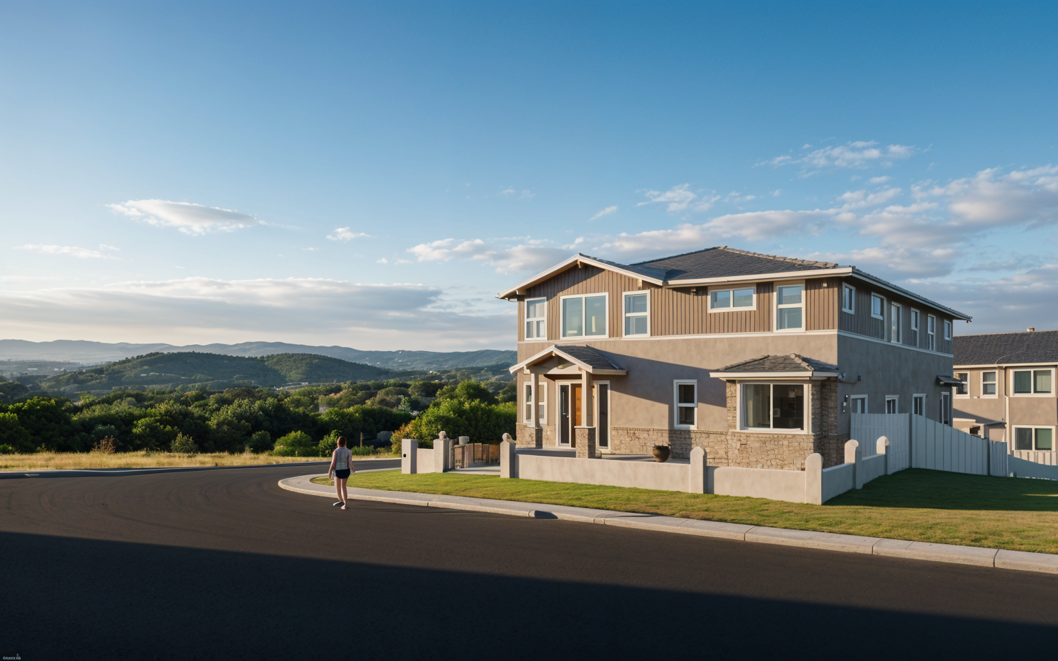 exterior shot do not deviate from the architecture add a nice sky with some sunshine and clouds make the image realistic add grass and shrubs architecture
