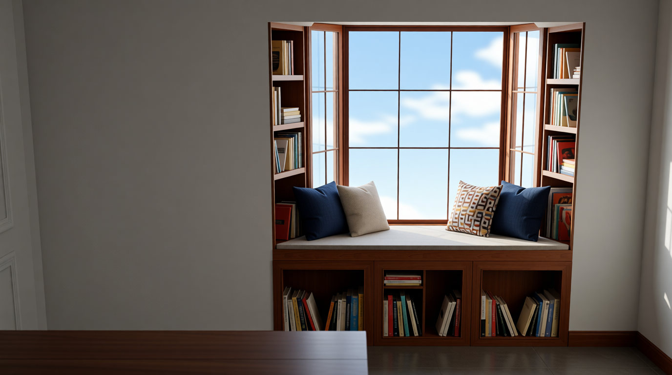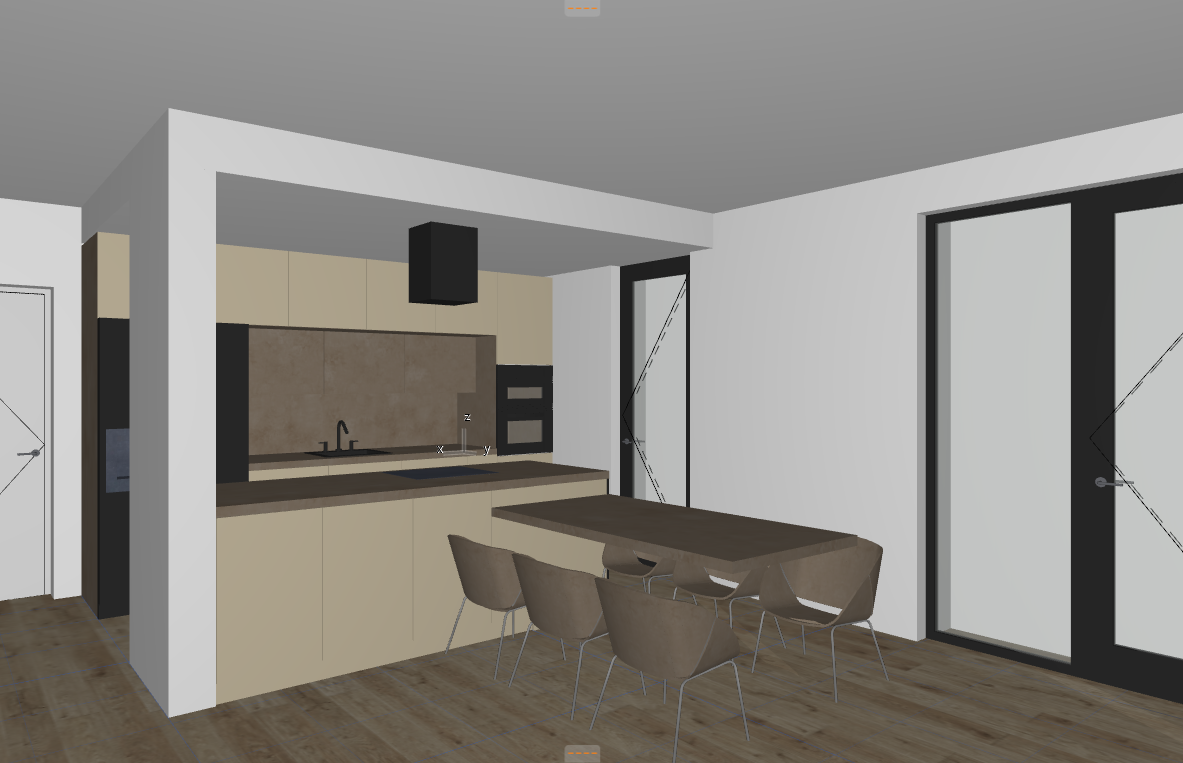 render a modern kitchen with a minimalistic design use soft beige for the cabinets and a warm brown for the countertops the walls should be a crisp white and the floor a medium tone wood design the chairs in a sleek dark brown matching the table incorporate black accents for the appliances and lighting fixtures the atmosphere should be inviting and contemporary with natural light filtering through large windows to enhance the elegant and cozy ambiance