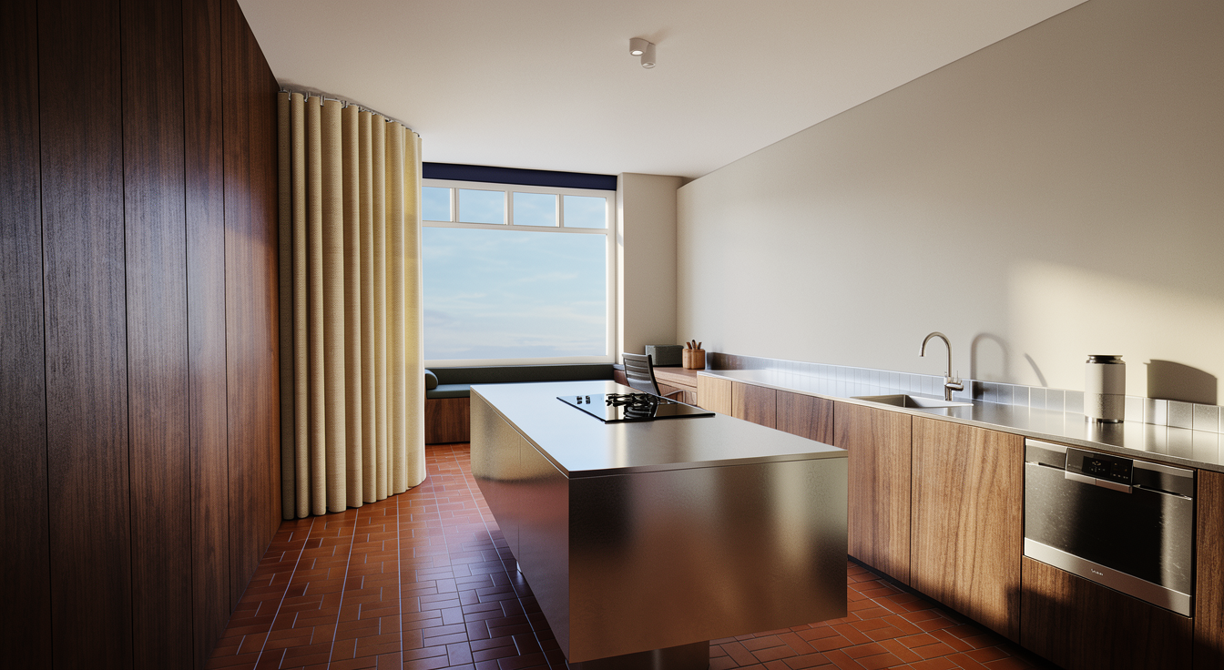 mkae the center kithcen of stainless steel also make the kithcen on left side fully of stainless steel