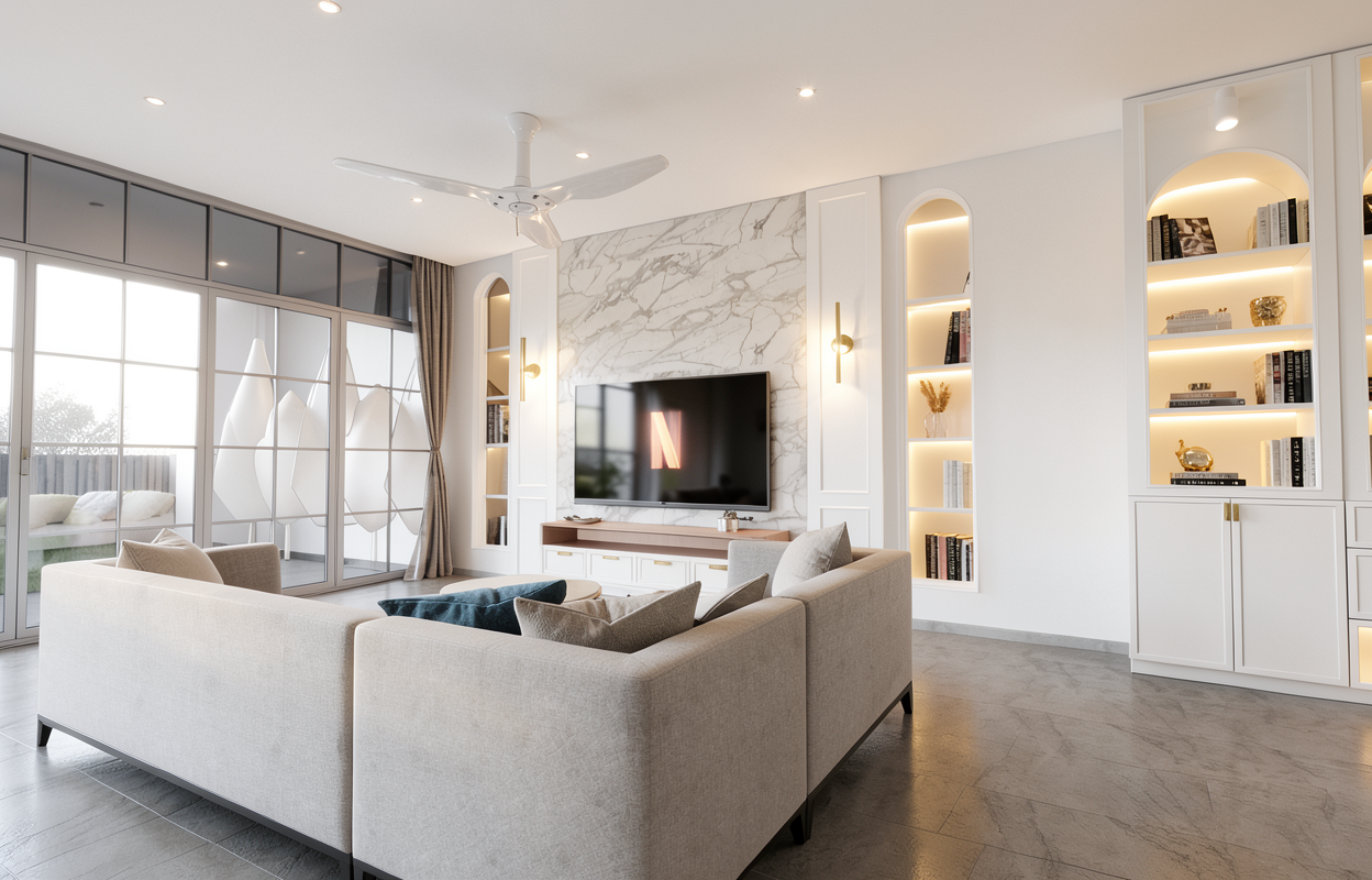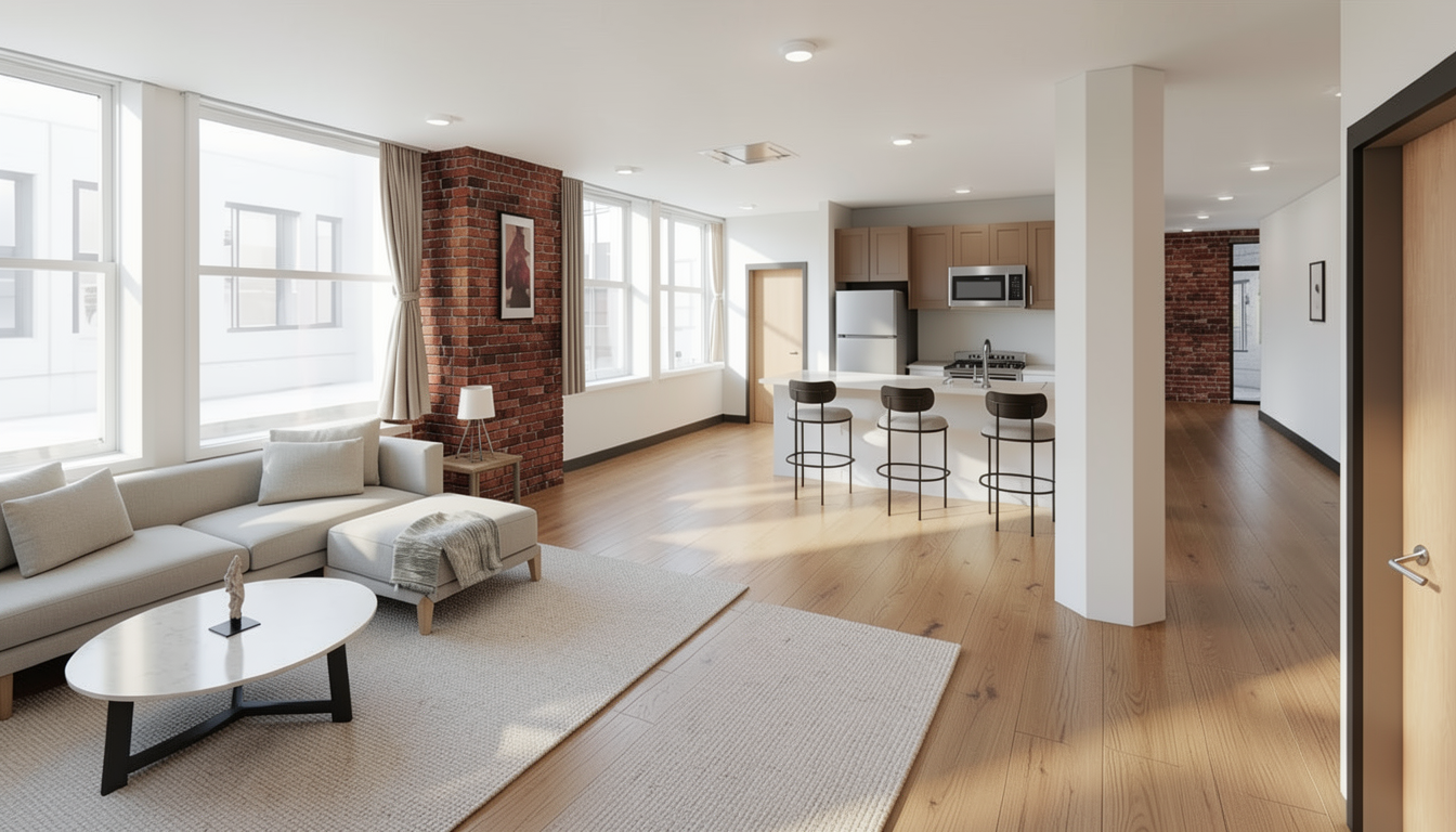 high resolution interior render emphasizing material textures only exposed red brown brick wall with natural variation and soft mortar lines large industrial style windows with white mullions clear daylight streaming in smooth white interior walls adjacent to brick light neutral woven rug texture on the floor warm wood tones with subtle grain for any horizontal surfaces soft diffused natural lighting with gentle shadows ultra realistic surface detail crisp edges no stylization no furniture specificity maintain contemporary industrial modern material palette maintain the kitchen color pallet on the cabinetry and maintain the floor color