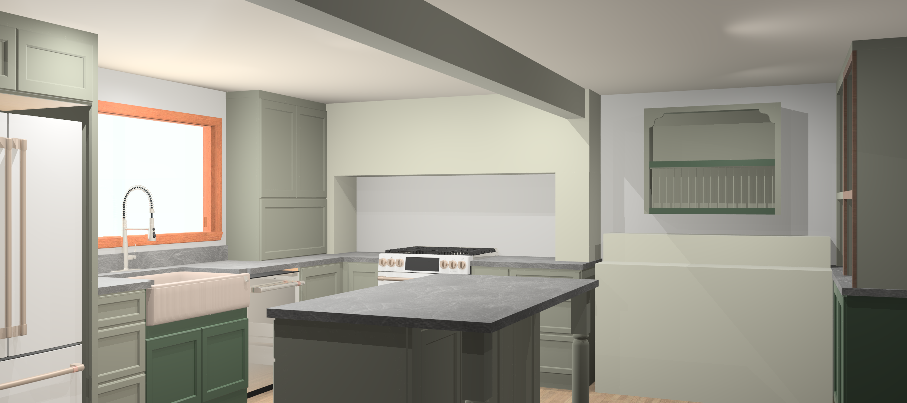 dark green cabinets dark counters offwhite 4 x4 zellige handmade tile behind range wood niche with shelves in side of wood hood shroud antique wood furniture under plate rack white sink white cafe appliances with brass hardware