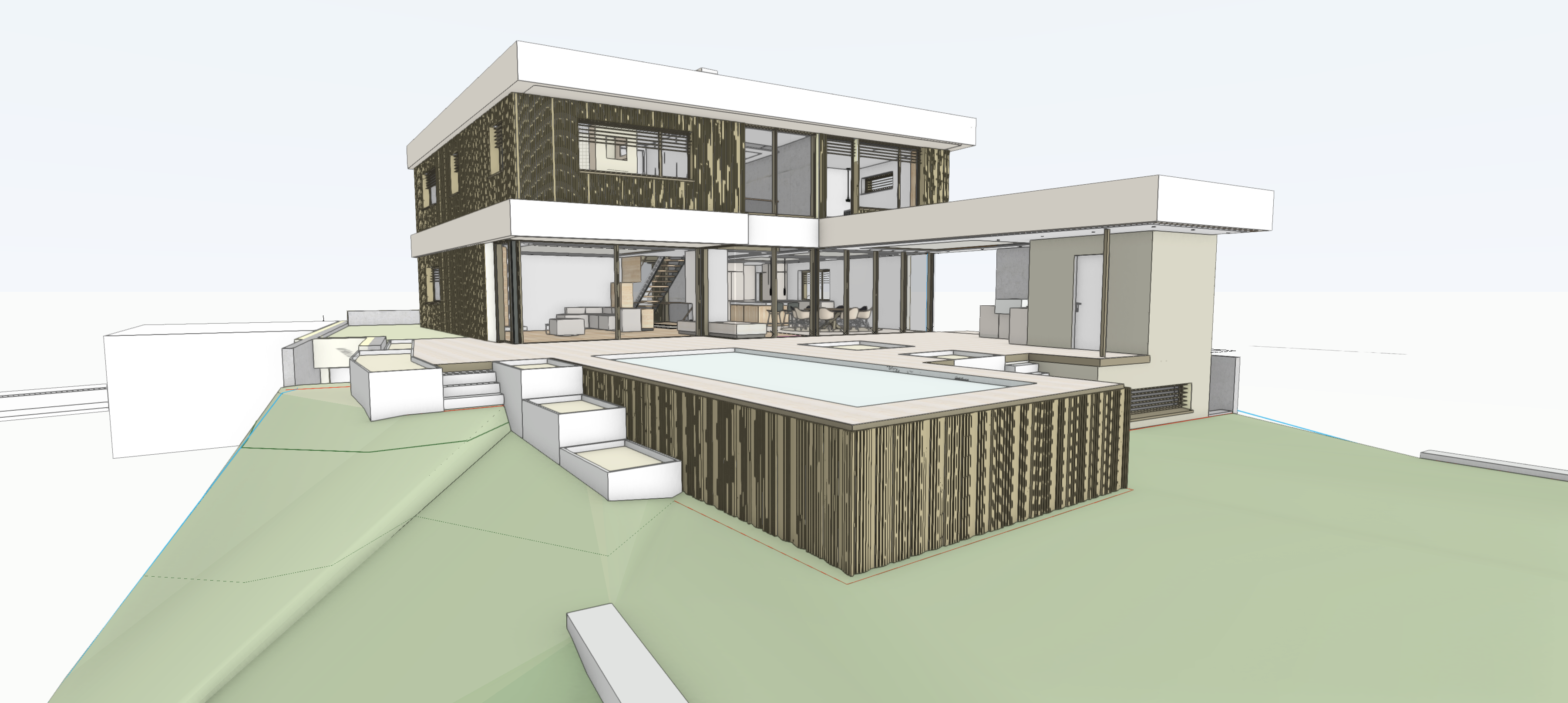 modern luxury house on a hill surrounded by lush greenery white walls paired with bronze linear textures for a sophisticated look glass windows reflecting the clear blue sky the pool is a shimmering light blue concrete elements in soft gray the overall ambiance is serene and elegant with a bright and sunny atmosphere