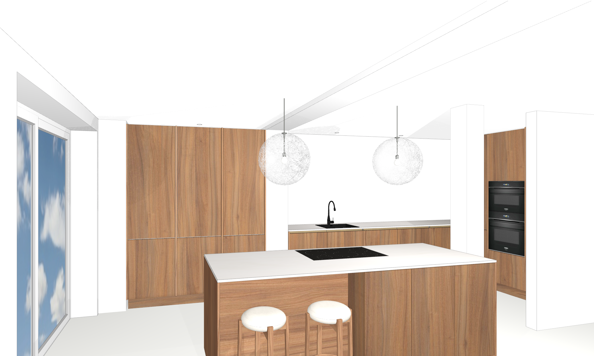 wallnut cabinets with panels between all doors and a matt offwhite ceramic worktop and matt offwhite microcement floor add some decor japandi style