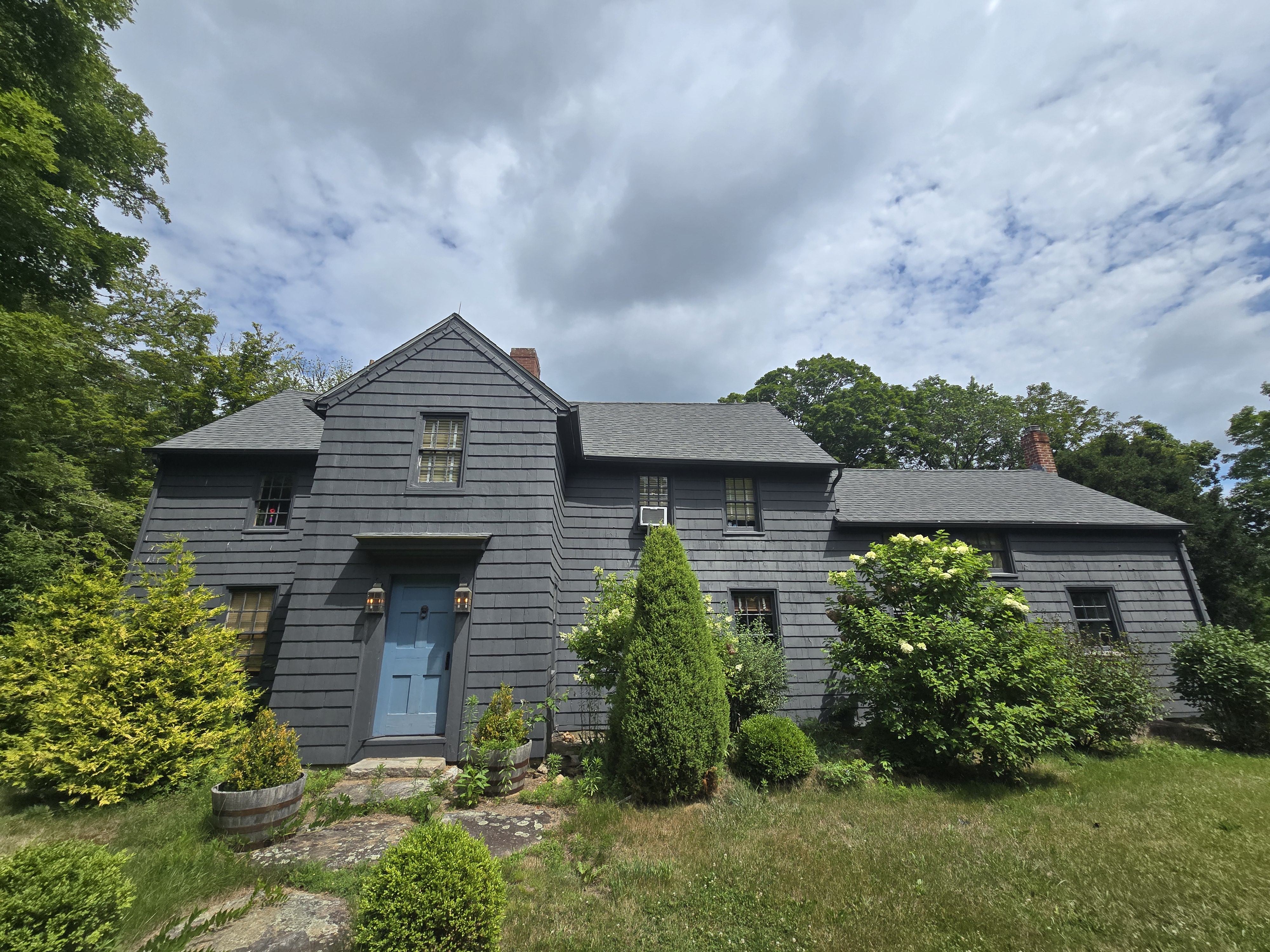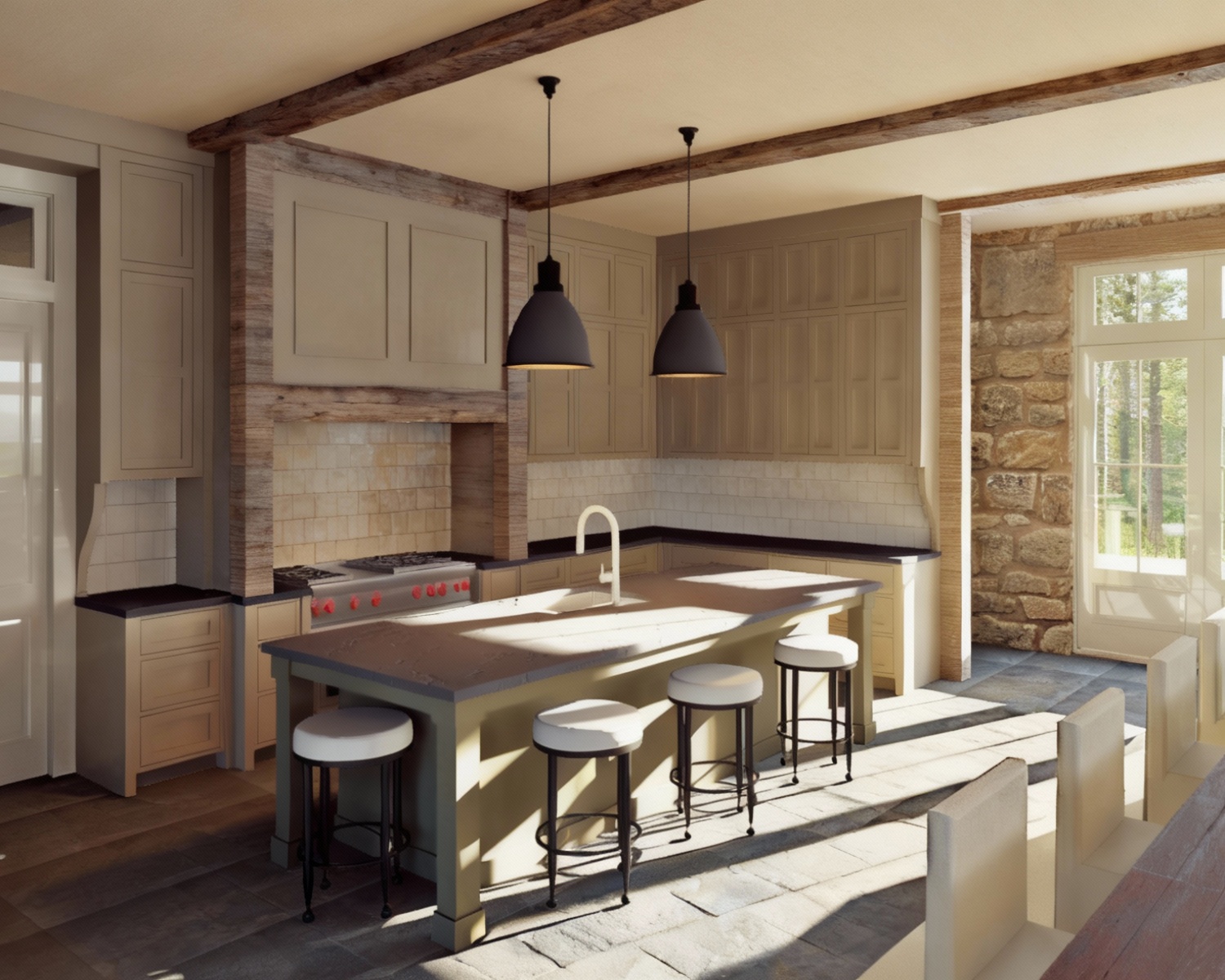 exterior shot render a scene in new england with matching siding and roof color and style as the mood board image make the standing seam metal roof above the patio doors copper and the patio be made of natural rock and bluestone add lush foliage and shrubs around yard and a beautiful blue sky on a fall day in new england