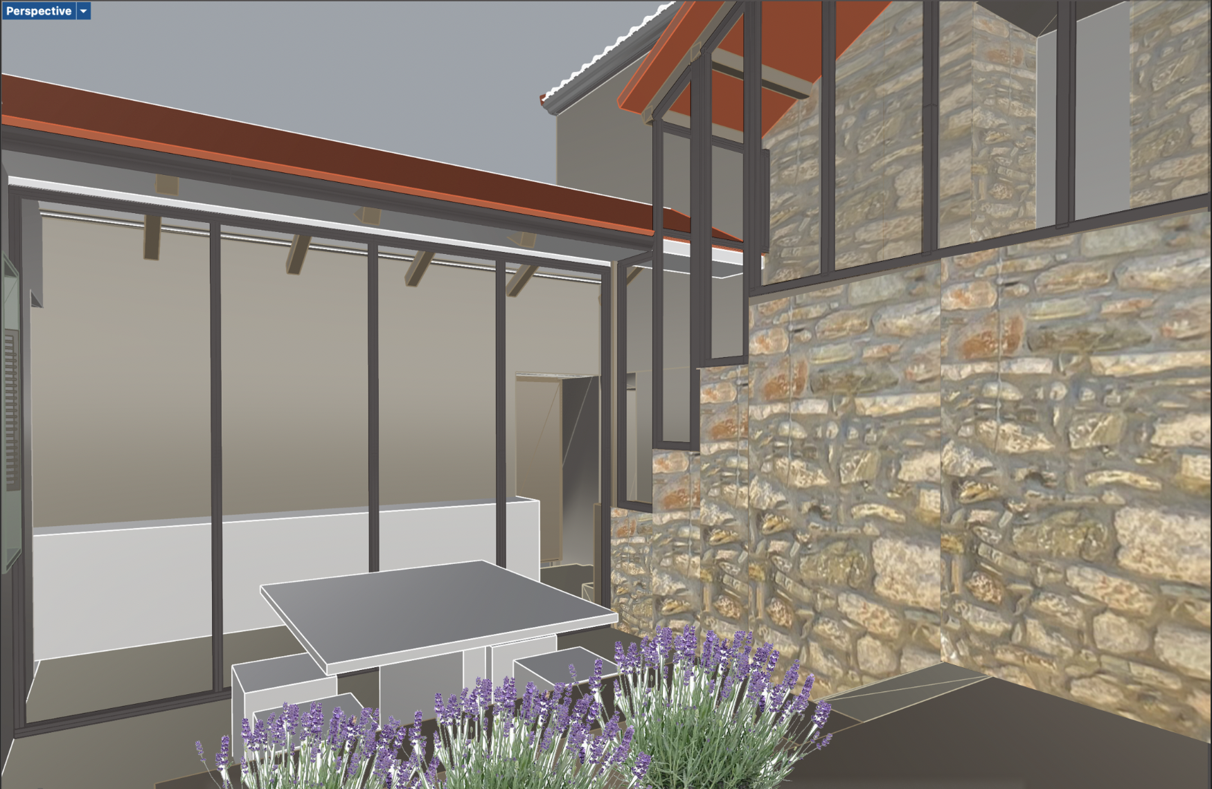 mediterranean revival exterior shot make this a realistic render keeping all shapes the shapes this is a courtyard of a cottage in the mediterranean the windows are aluminium brown colour and the walls are rustic stone walls the interior is a rustic austere dark wood kitchen architecture