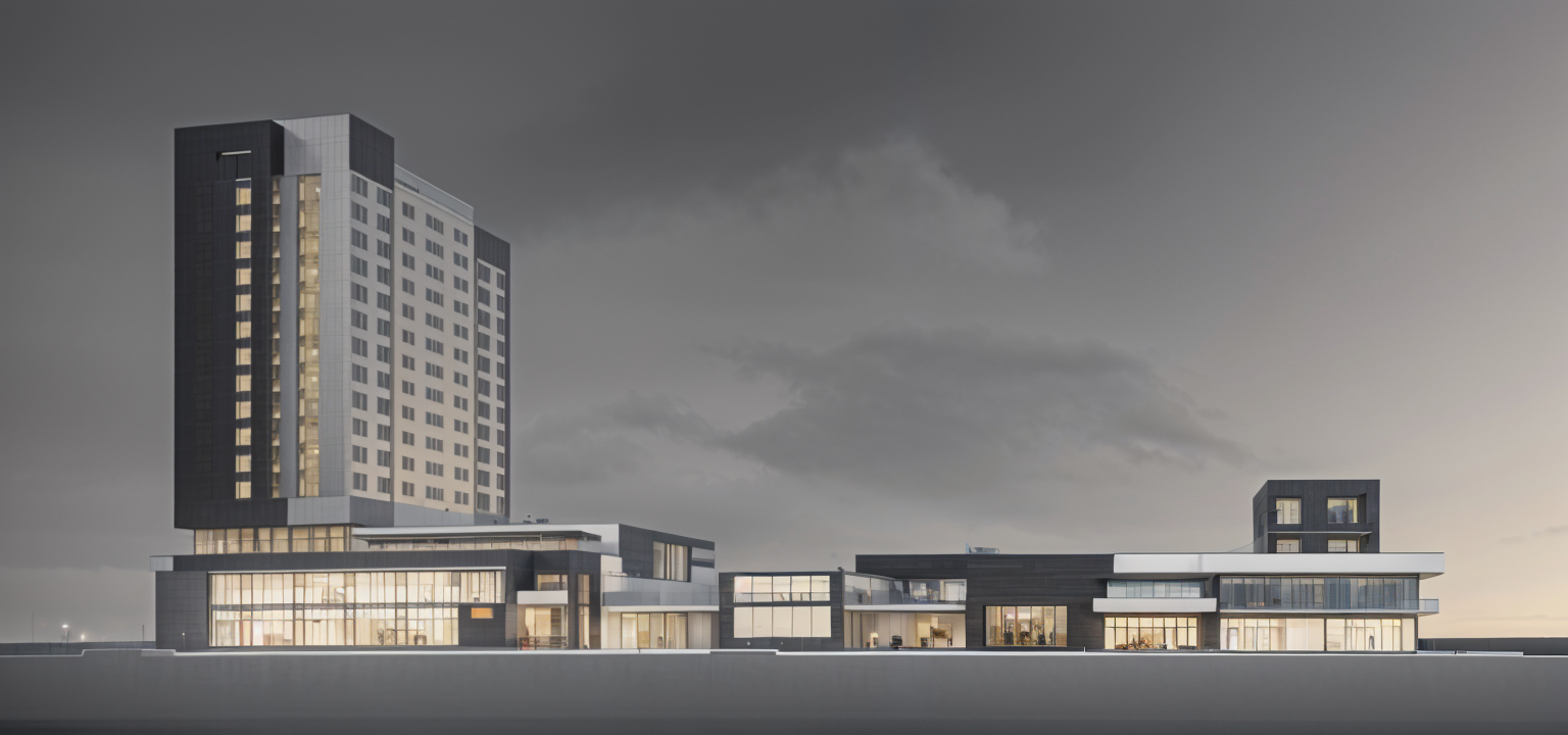 contemporary perspective shot photorealistic render set in the evening add human activity vibrant colours and lighting to create a lively mood architecture