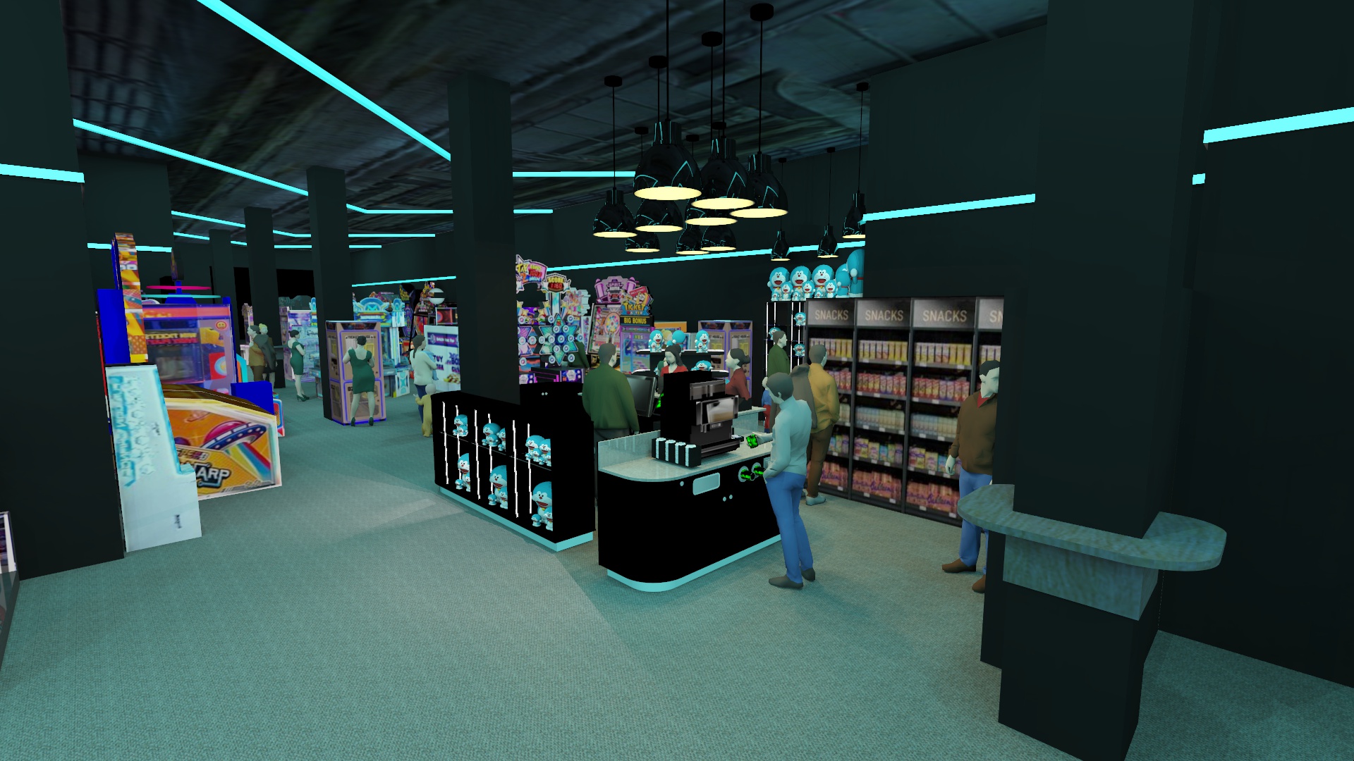 an arcade and gaming hall the machines glow brightly black walls and a black ceiling the floor covered in gray carpet turquoise light lines on the ceiling and turquoise lighting under the furniture create a photorealistic effect