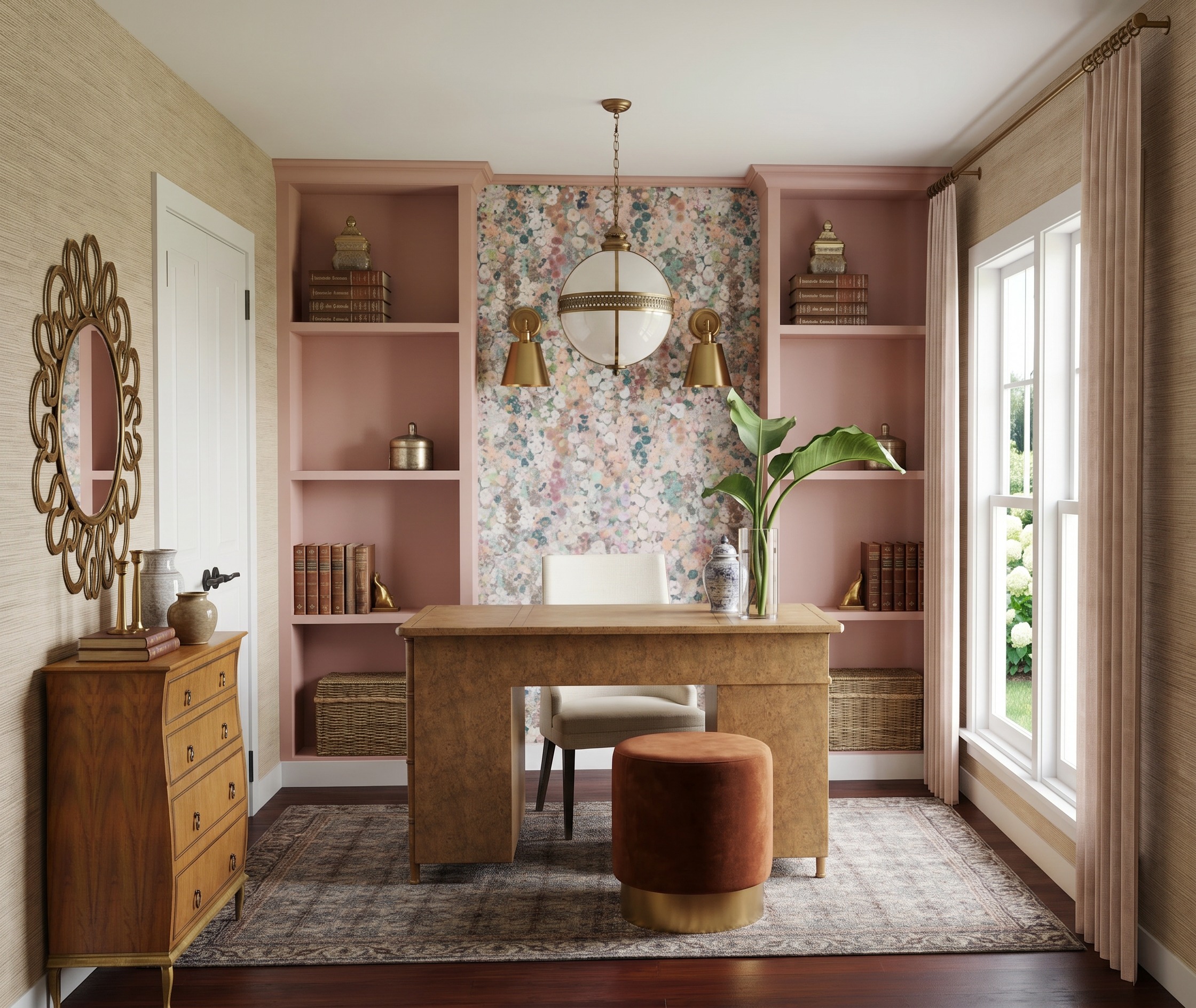 keep everything the same the floors are a mahogny wood the left and right walls have beige grasscloth wallpaper the outside environment has annabelle hydrageas right by the window the ottoman has a rust brown velvet the cabinet on the left has some books and decor on it the cabinet on the left is a red walnut color the door on the left is open so you can t see the door the rug is a grey and brown color and keep the pattern the mirror on the left is a brass the sconces on the back wall have a navy ikat pattern on the shades the bookcases on the back wall are a dark salmon brick color