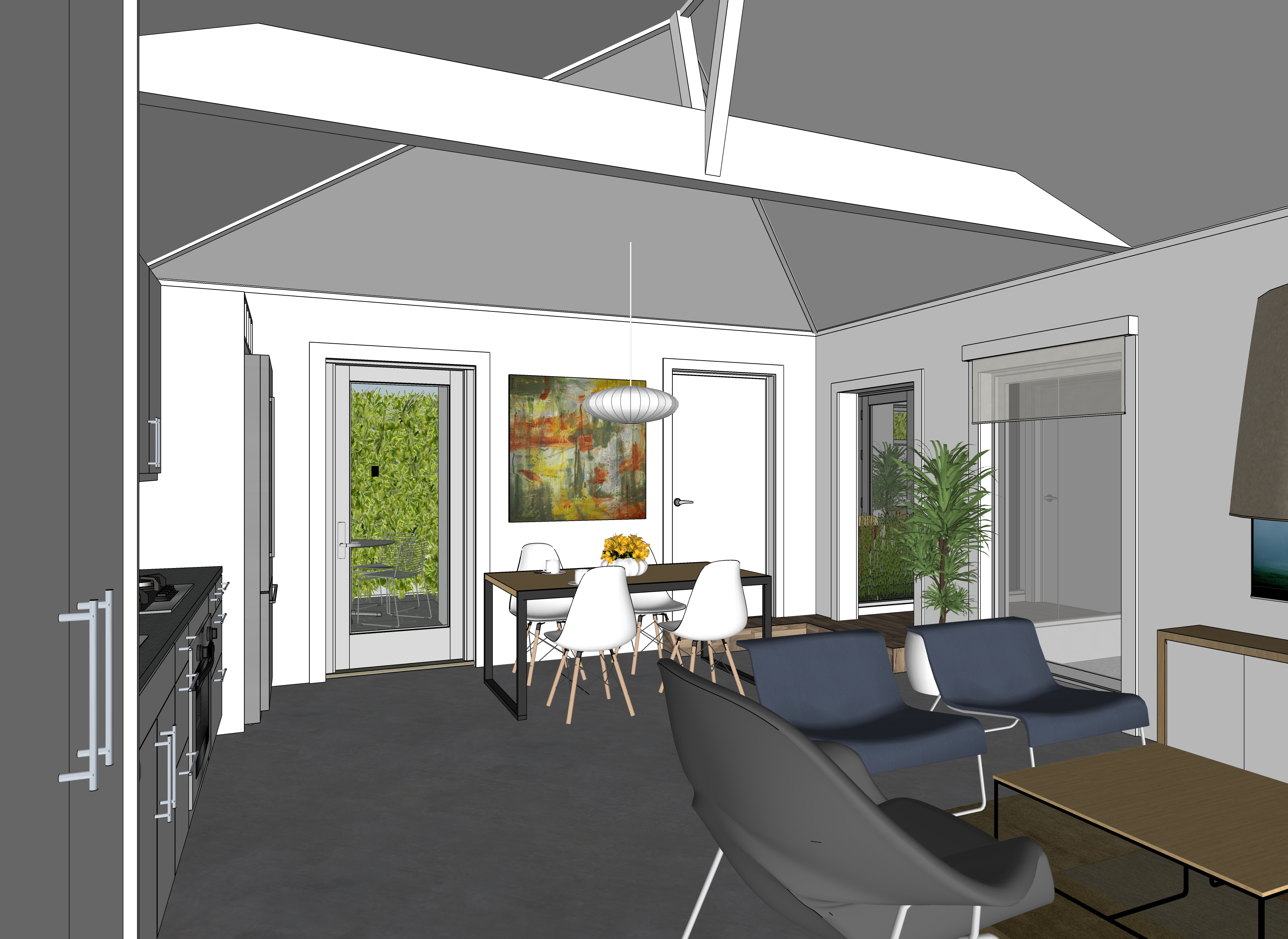 afternoon lighting make the floors semi gloss concrete make the kitchen cabinets white matte finish add placemats and silverware glasses to the dining room table make the ceiling white matte paint finish add under cabinet lighting for the kitchen counter tops add a woman in the kitchen facing the stove add some magazines and books on the coffee table add a man sitting on the patio chair outside on the terrace