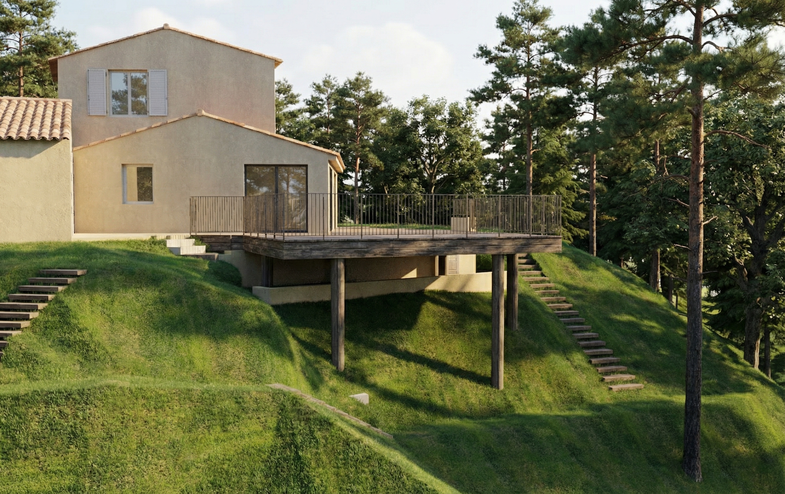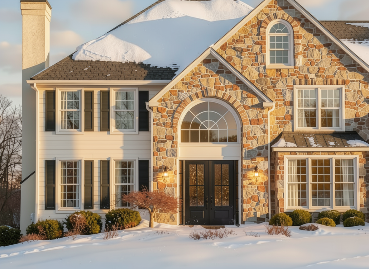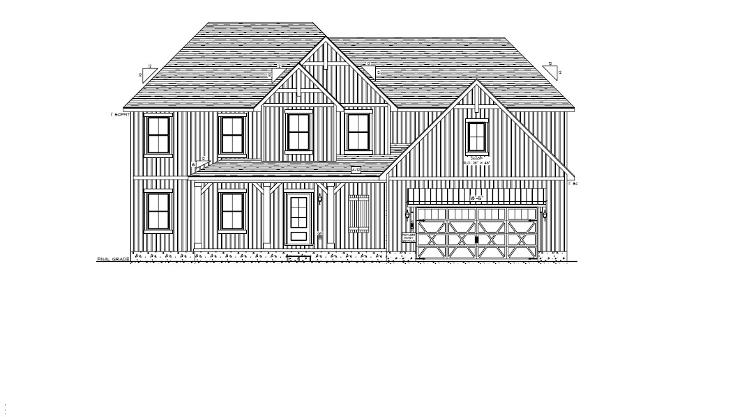 make as photorealistic as possible while keeping textures the same as selection professional landscaping in a lightly wooded scene with good lighting white siding black shingle roof black windows white garage door to match plan black front door