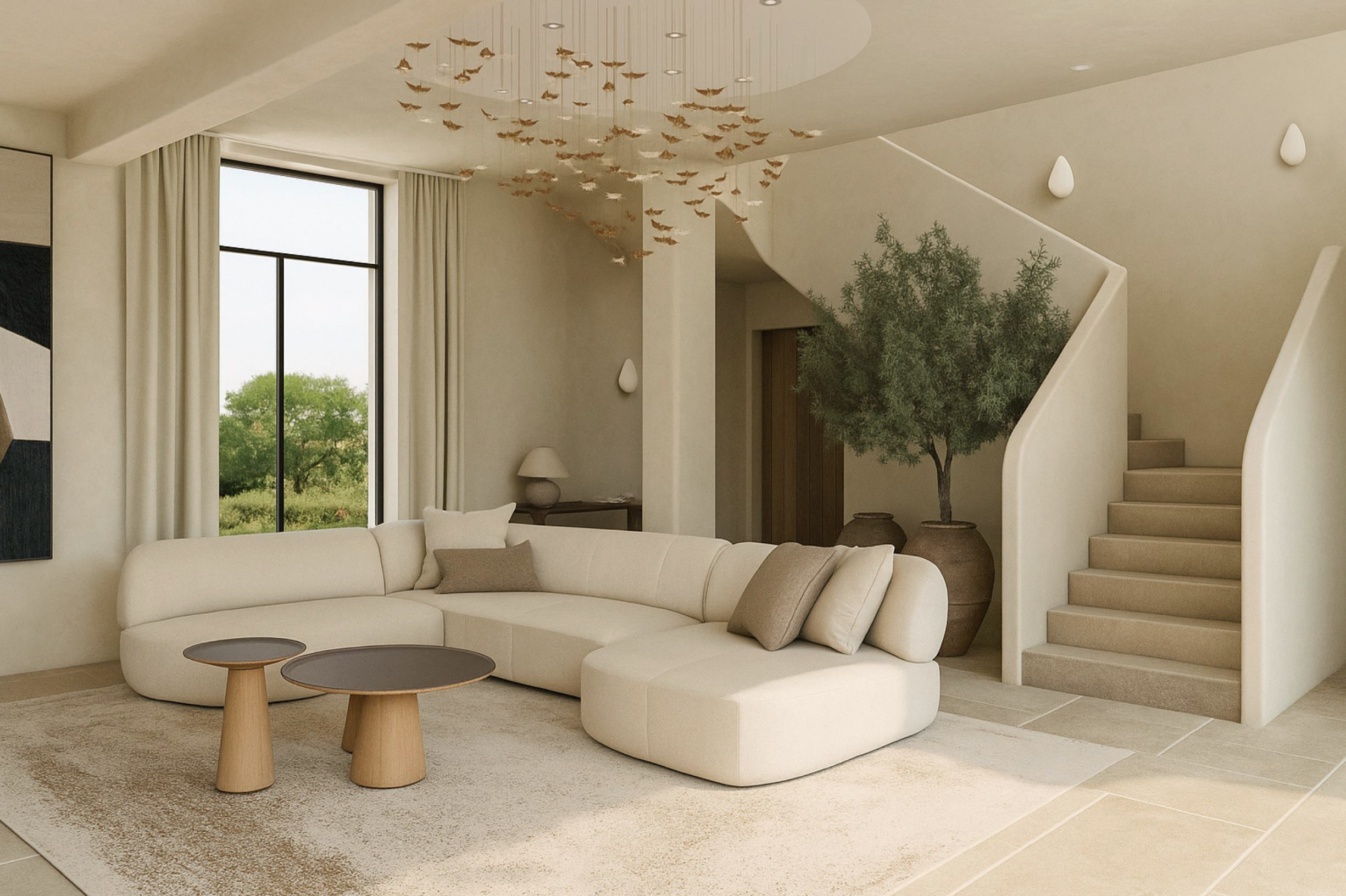 make the image look like a professional photograph in terms of lighting colors and contrast with maximum realism use existing textures materials and colors everywhere use the details textures and colors from the photo do not change the architecture colors and materials of the interior do not change anything like details in the interior make the curtains realistic all walls and ceilings to be in the same color and texture namely in warm white lime plaster make the spot lights in the ceiling glowing do not change the colors and materials of the entire interior keep the existing colors and textures keep the colors of the walls do not add additional lighting fixtures except those that already exist in the image make the image in 4k