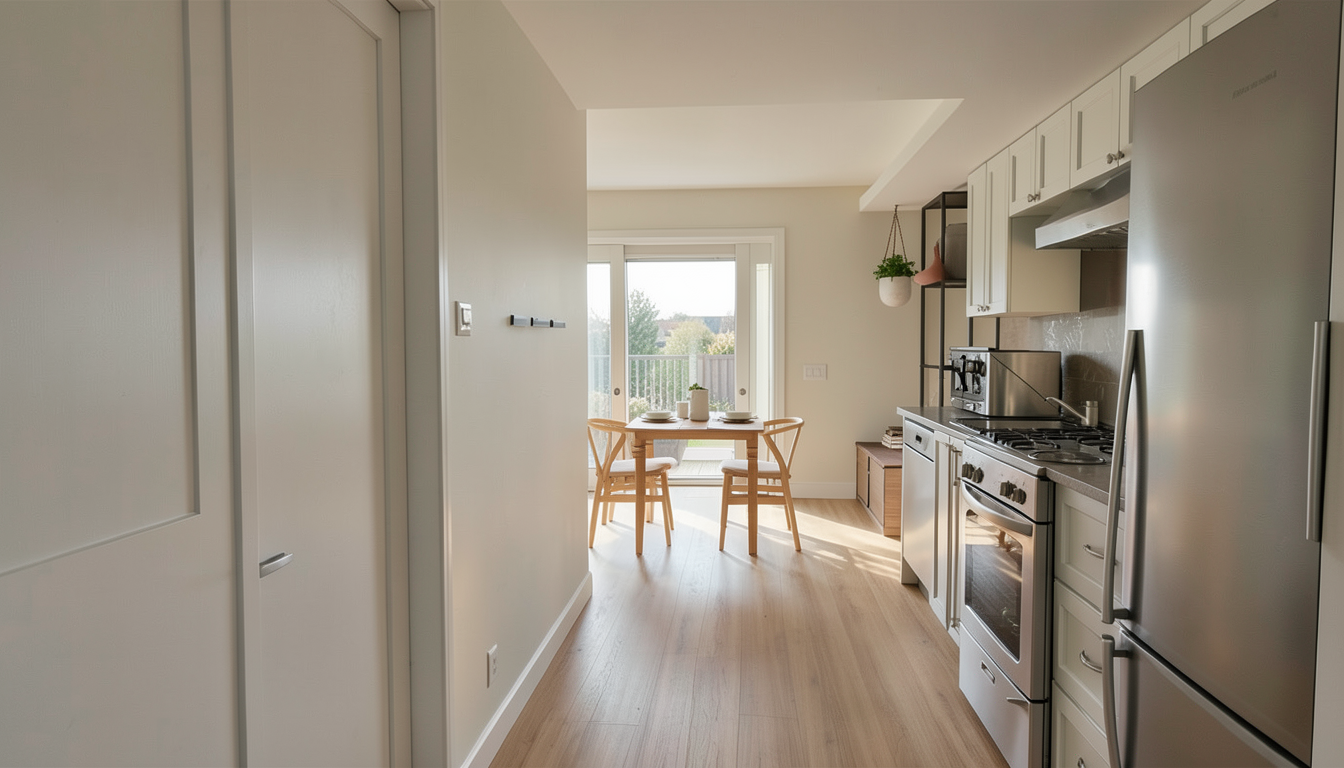 this is an interior space called the architecture factory which is an education space for architecture students it has metal lime green shipping containers white desks a plain painted concrete floor and internal rooms on the right hand side with black metal window frames