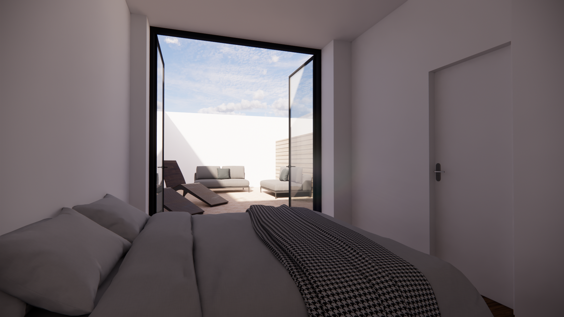 modern bedroom with doors opening up to yard with seating area and a lot of greenery the flat is in athens greece modern artwork above bed