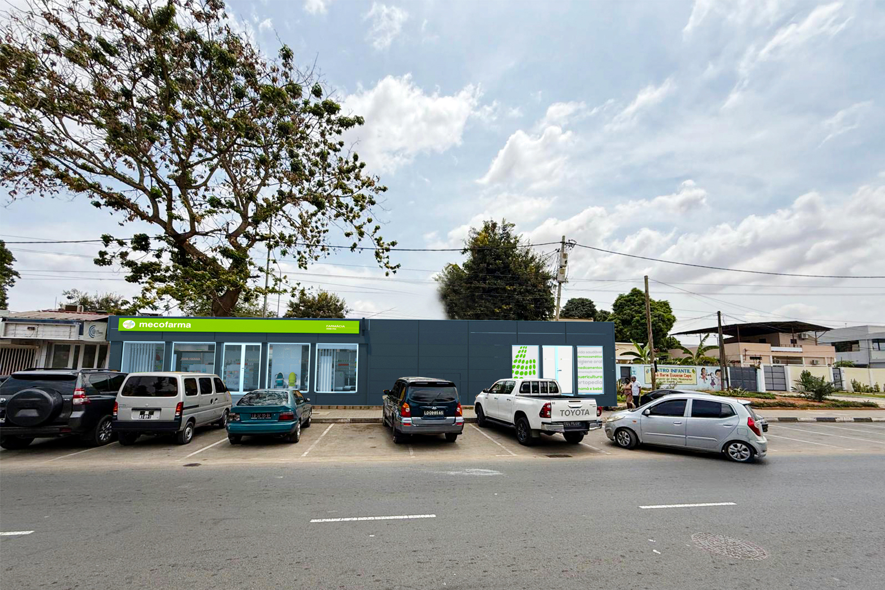 create a vibrant photorealistic scene of a pharmacy building with a storefront featuring white lettering the facade is sleek and modern blending gray and blue tones the street is filled with parked cars in various colors like black white silver and green in front of the building there s a majestic tree showcasing deep green leaves contrasting with a pale blue sky dotted with fluffy white clouds the atmosphere is serene and pleasant evoking a sense of calmness and everyday life in a quiet suburban setting
