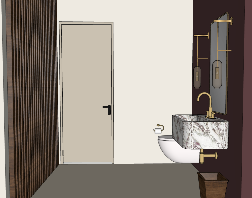 render this bathroom scene as a photorealistic interior do not change the design colors proportions materials fixtures or layout keep the exact camera angle and composition the room has no windows so do not add natural light or window shadows use soft even ambient lighting and subtle fixture based illumination to enhance realism maintain all existing elements exactly as shown only improving material depth reflections subtle shadows surface texture and overall clarity while keeping the lighting consistent with a windowless space
