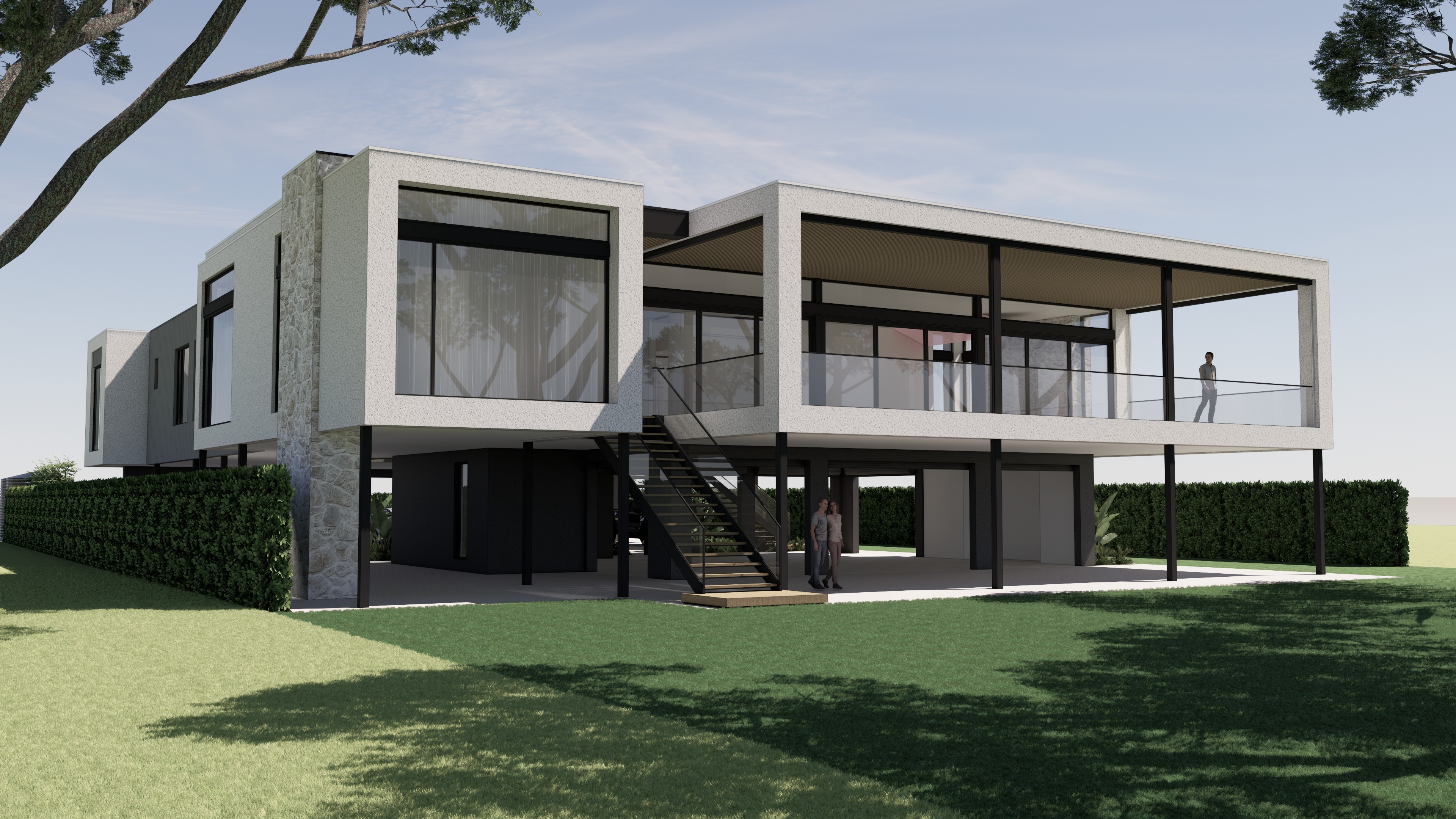 enhance existing geometry with hyper realistic high fidelity material mapping amplify the tactile qualities of the honed mount lofty sandstone to reveal subtle pitting mineral veining and natural grit making the stone look exceptionally tactile refine the matte architectural steel with ultra fine grain and soft specular highlights optimize floor to ceiling high performance glazing with physically accurate thickness edge refraction and a subtle high performance tint apply bright directional early afternoon sunlight 5000k 5500k with high contrast sharp shadows that define the building s form introduce intricate realistic ambient occlusion in all recessed areas for deep definition shift the reflection of the deodar cedar to depict its dense soft needles under the bright light integrate a highly detailed realistically rendered garden into the reflections featuring varied leaf textures e g broad leaf shrubs finer ferns with physically accurate subsurface scattering to simulate sunlight filtering through foliage add clear reflections of surrounding residential architectural details ray traced global illumination high dynamic range hdr color grading zero noise and ultra sharp 8k textural detail throughout the entire scene