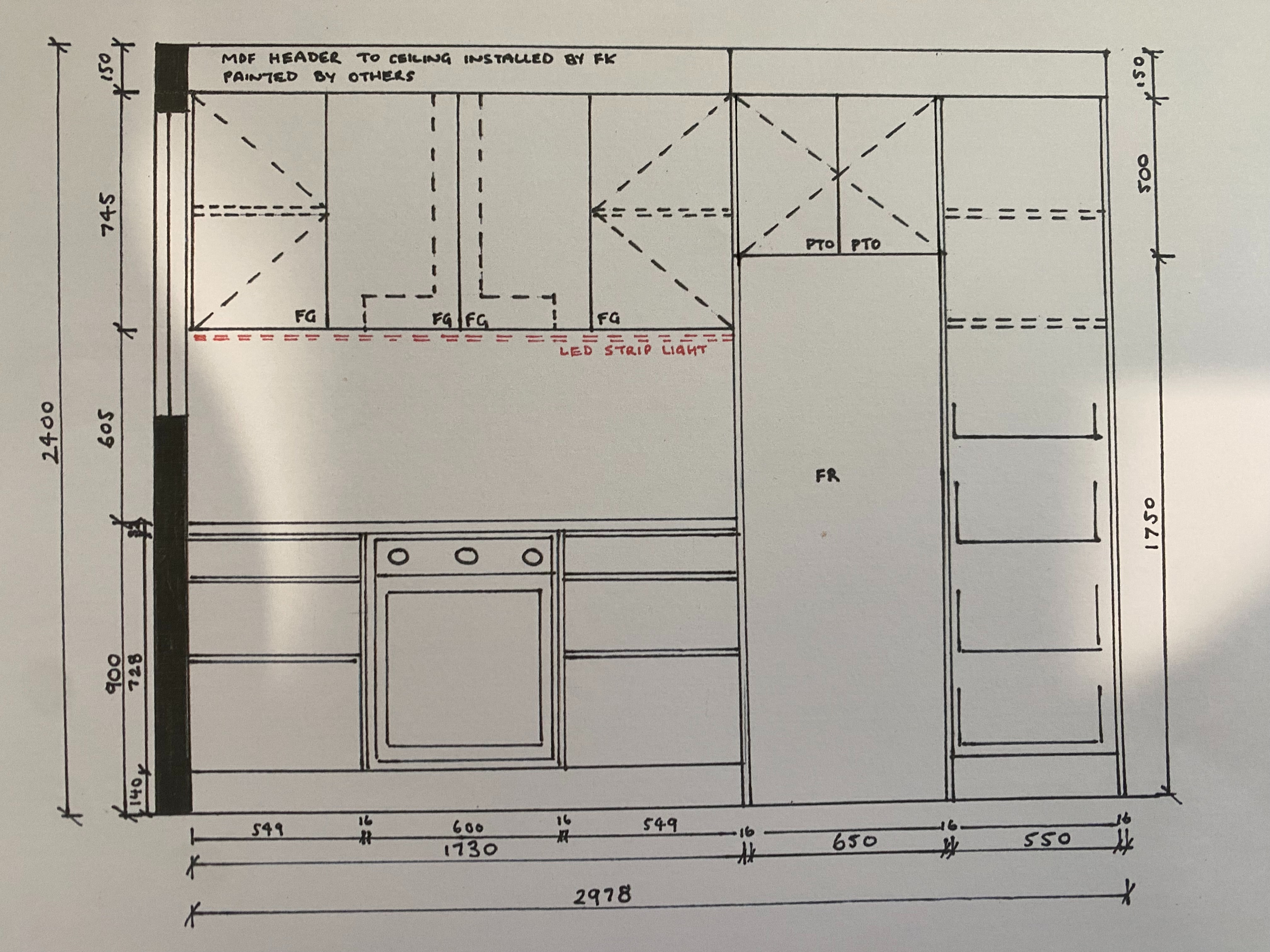 show natural light show cabinets laminex parchment add decor tile splashback show led light to underside of overhead cabinets remove dimensions and lines show pantry door to right hand side of fridge floor to ceiling show cabinet above fridge to finish flush with fridge