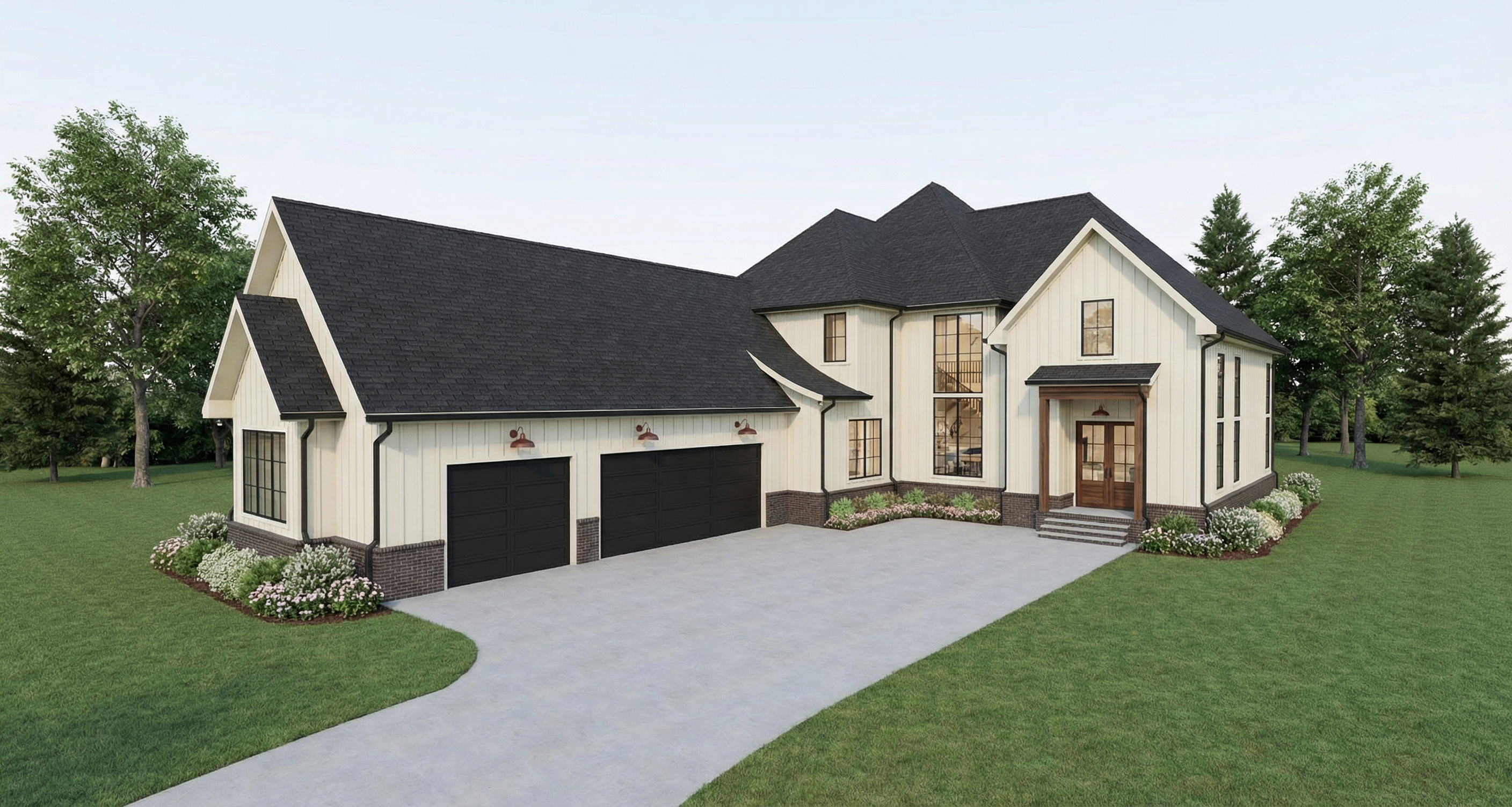 place this into a temperate rainforest setting with a river in the background all gray are gravel pathways areas place a firepit and adirondack chairs in the center gravel circle
