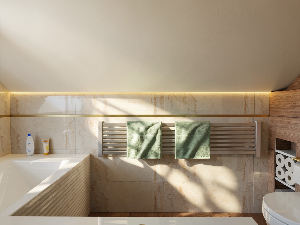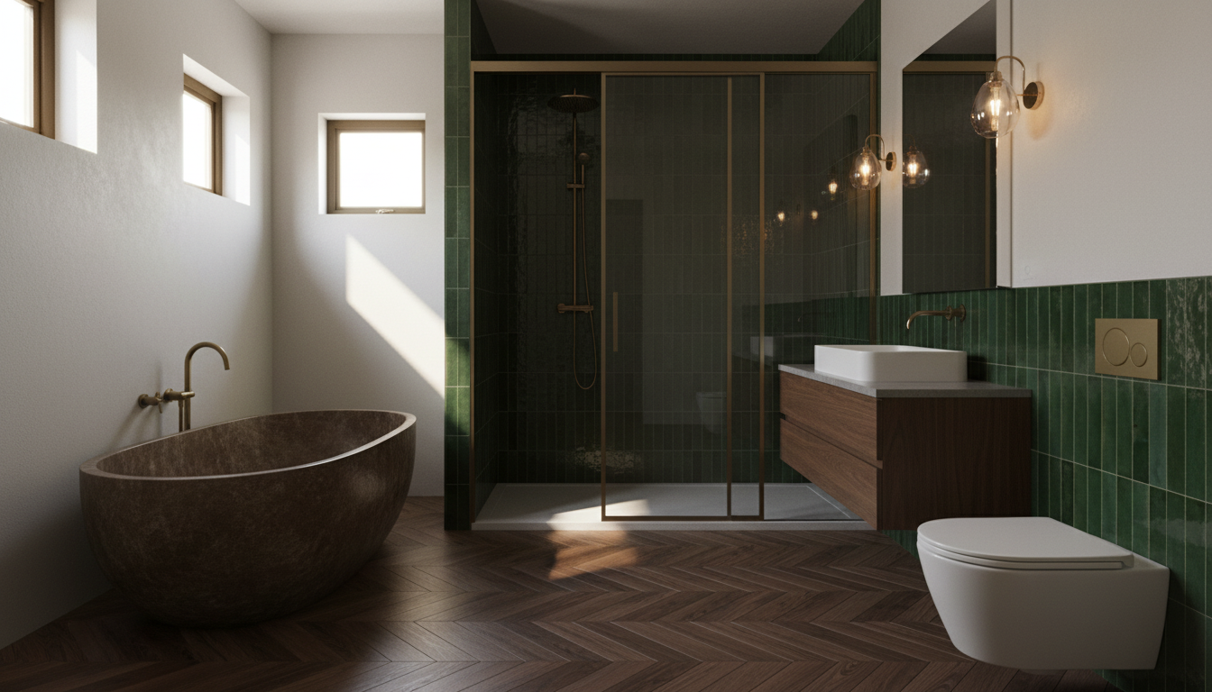 create a serene and luxurious bathroom scene based on the given layout the room dimensions are narrow approximately 11 x 6 design a modern japanese scandinavian bathroom from the pov of the entry on the right is the toilet followed by a minimalist walnut wood floating vanity with a sink sunk into it on either side of the mirror and handblown glass light fixtures in front of the viewer on the back wall is a fully enclosed shower area a dark green tiled spa steam shower the doors to the shower slide and seal to hold in steam on the left opposite the vanity include a dark brown stone freestanding oval bathtub on the left that sits directly on the floor include two small windows on the left above the tub that allow direct sunlight in use a color palette of neutral tones charcoal wood stone for a zen calming effect with matte brass fixtures the atmosphere should be peaceful and spa like inviting relaxation and tranquility no plants add dark walnut herringbone flooring try some new materials