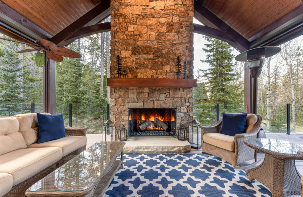 modernist interior shot living room in a bc suburban home brick fireplace with white mantel gas insert beige carpet cozy furnishings daylight through sliding patio door typical west coast family home style architecture