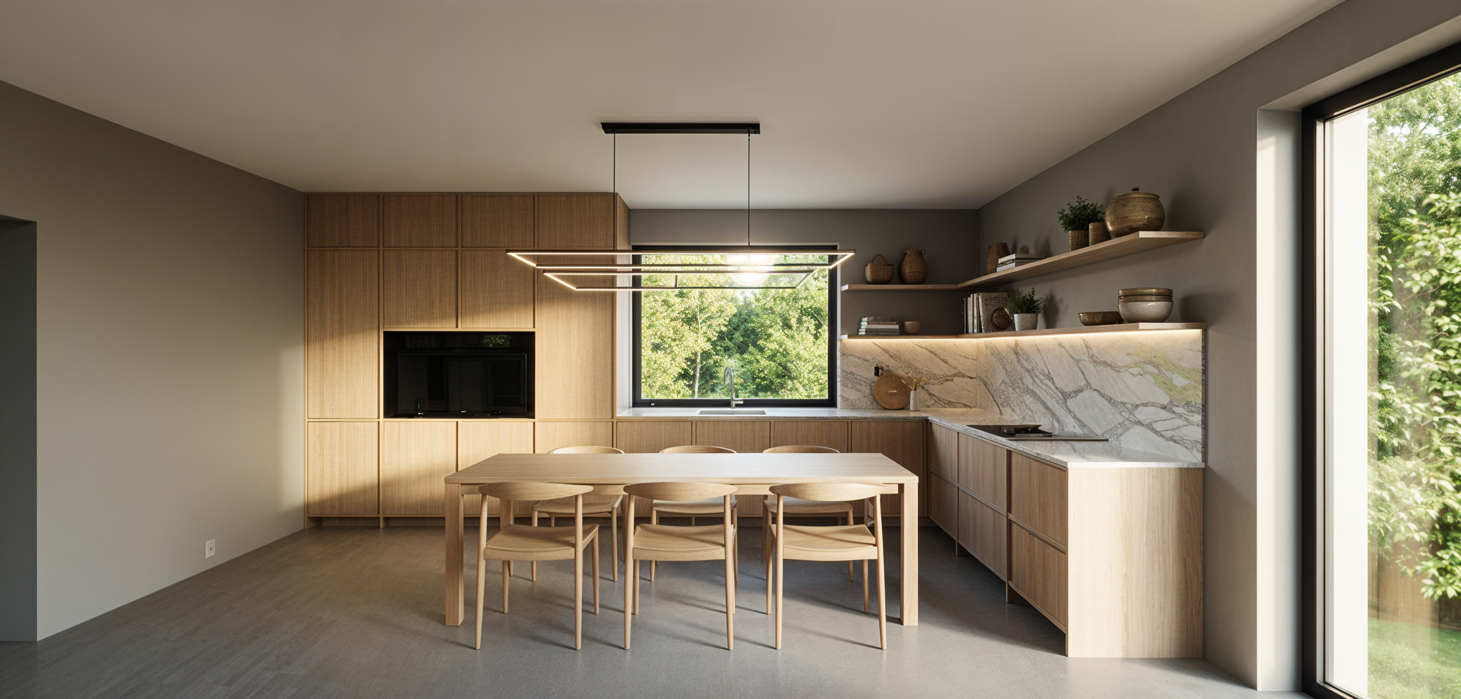 move the table 600mm to the grey wall add downlight in the kitchen ceil ing
