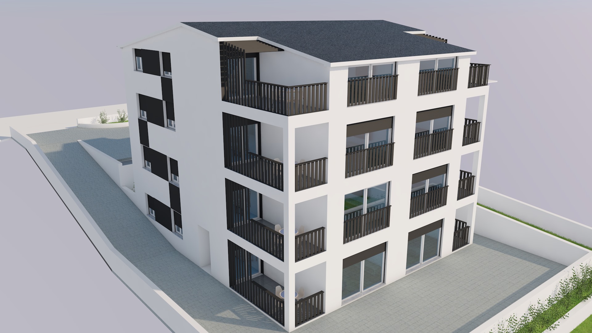 photorealistic modern mediterranean apartment building preserve original architecture preserve original colors and materials clean white plaster facade dark metal balcony railings matte black realistic glass reflections paved courtyard around the building large format concrete or stone pavers clean and modern paving design subtle joints realistic textures tidy and well organized outdoor space dalmatian karst landscape beyond the plot dry stone walls minimal greenery add a narrow asphalt road behind the building at the upper side of the plot warm golden hour sunlight soft shadows high detail architectural visualization no material changes no color changes no redesign