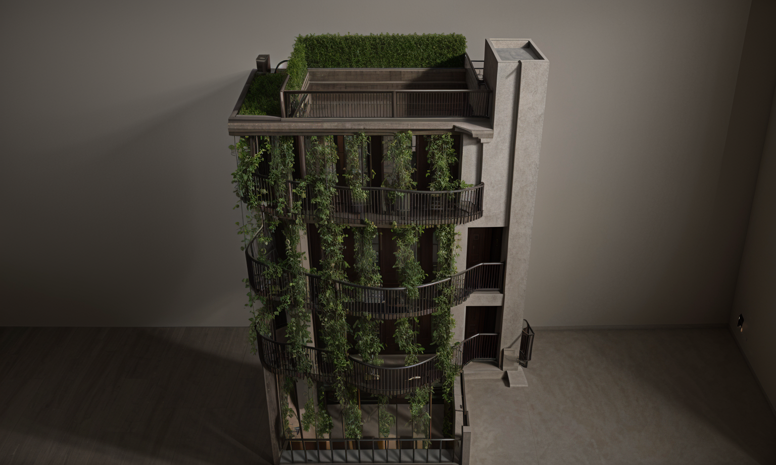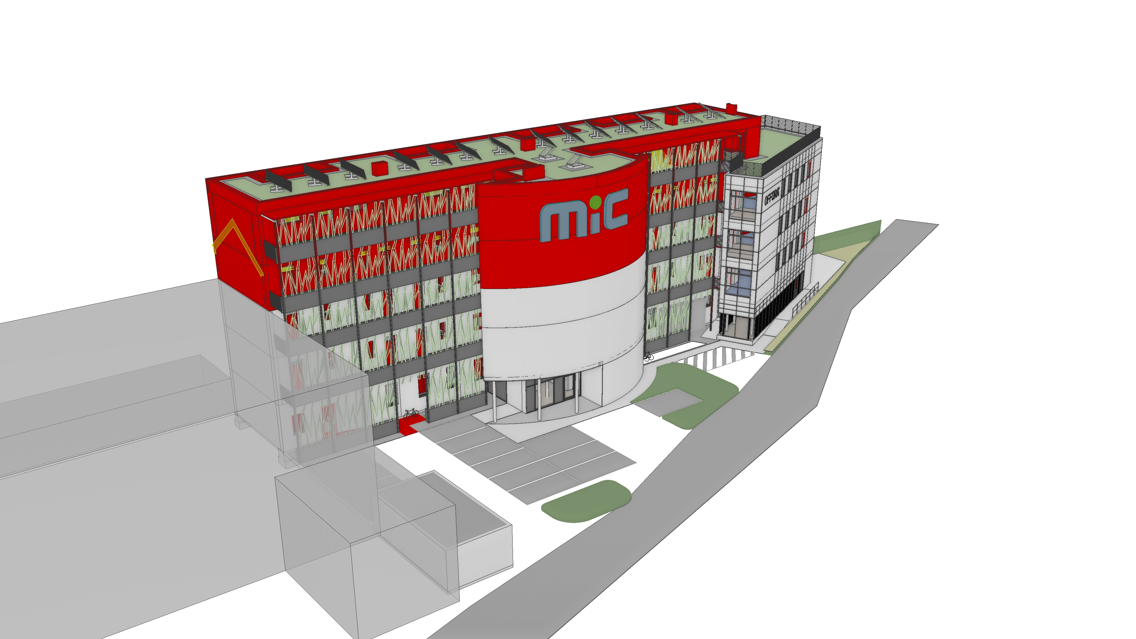 white facade and everything that is now red is to become grey partially suspended vertical planting rounded tower with the inscription mic urban surroundings make it real