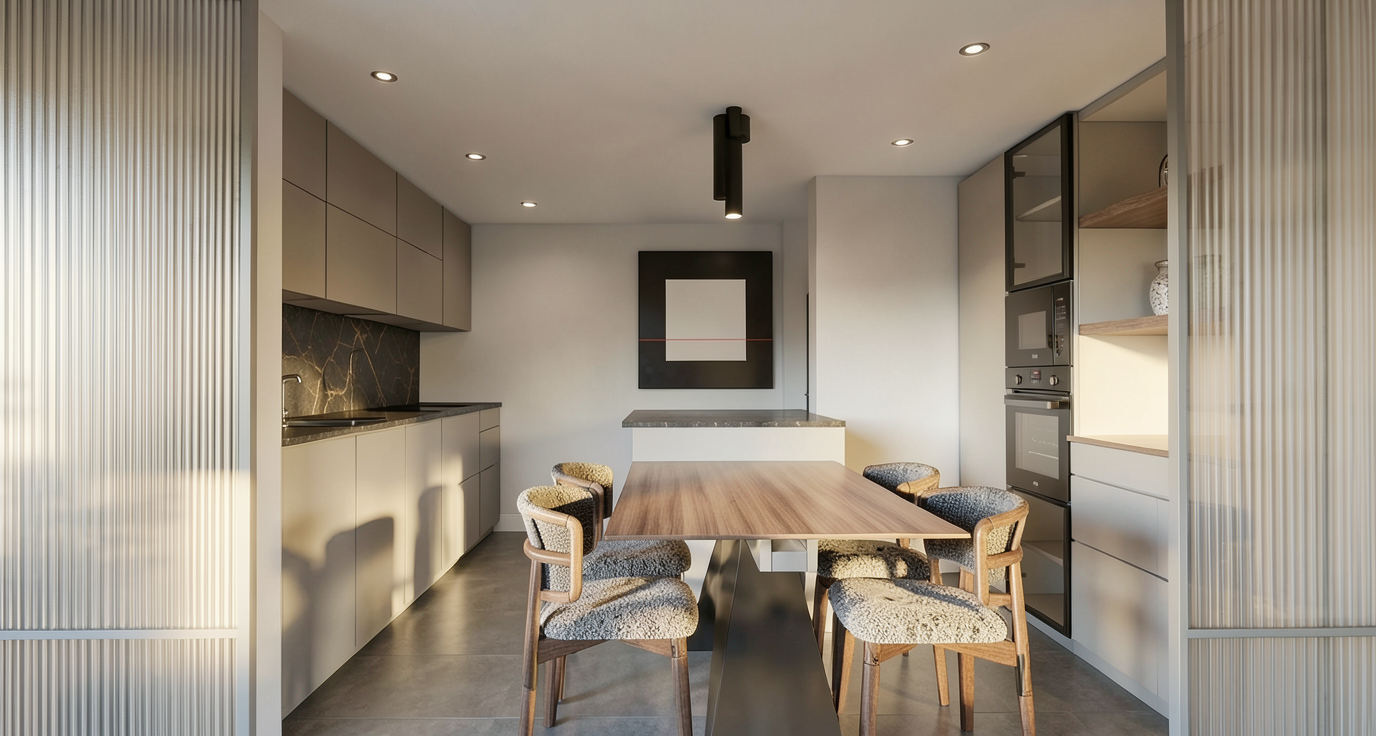 ground floor natural stone upper floor dark green horizontal facade dark grey green window frames solar panels roof