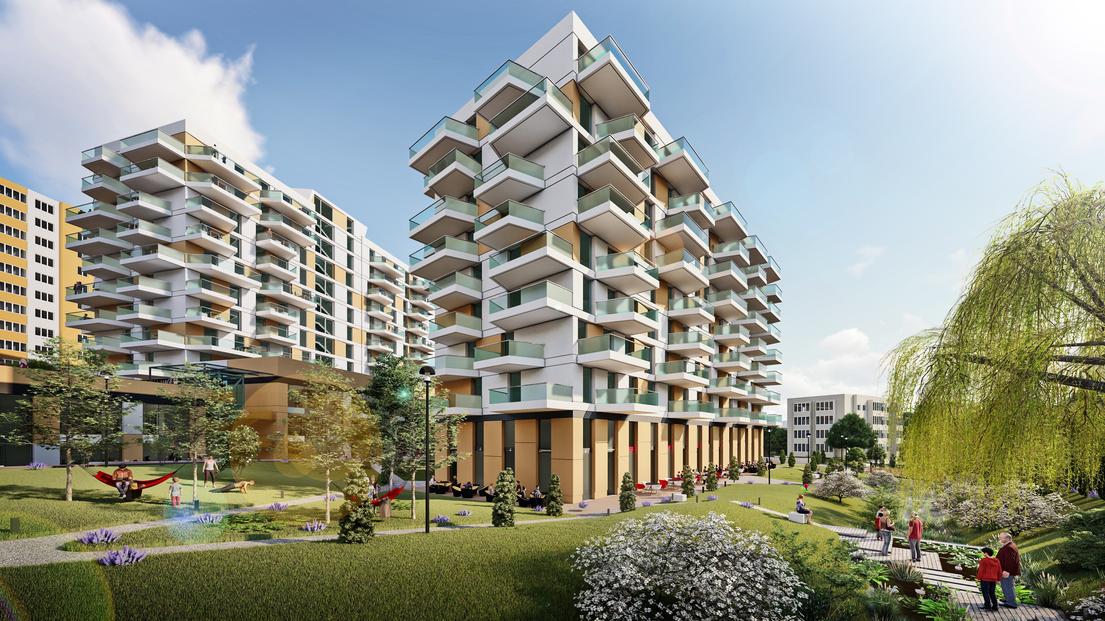 important preserve the existing geometry and the existing context exactly as provided do not modify alter reinterpret add remove scale or reshape any geometry do not change the site surroundings street layout neighboring buildings vegetation or context elements do not modify geometry scale proportions buildings road layout sidewalks or surrounding context in any way do not change text photorealistic architectural rendering clean and balanced contrast calm cinematic mood style contemporary european residential architecture minimalist premium understated include people and cars subtle motion blur for realism do not alter the church color soft overcast evening atmosphere diffused cold natural daylight with subtle blue grey tones cinematic architectural mood warm interior lighting 3000k glowing from inside creating strong contrast between cool exterior and warm interior large glass surfaces with realistic reflections soft mirror effect subtle environmental reflections of sky and surroundings slight volumetric haze in the air for depth gentle fog diffusion in background high dynamic range lighting realistic global illumination soft shadows calm and minimalist nordic mood photorealistic architectural visualization balanced exposure no harsh highlights delete all people