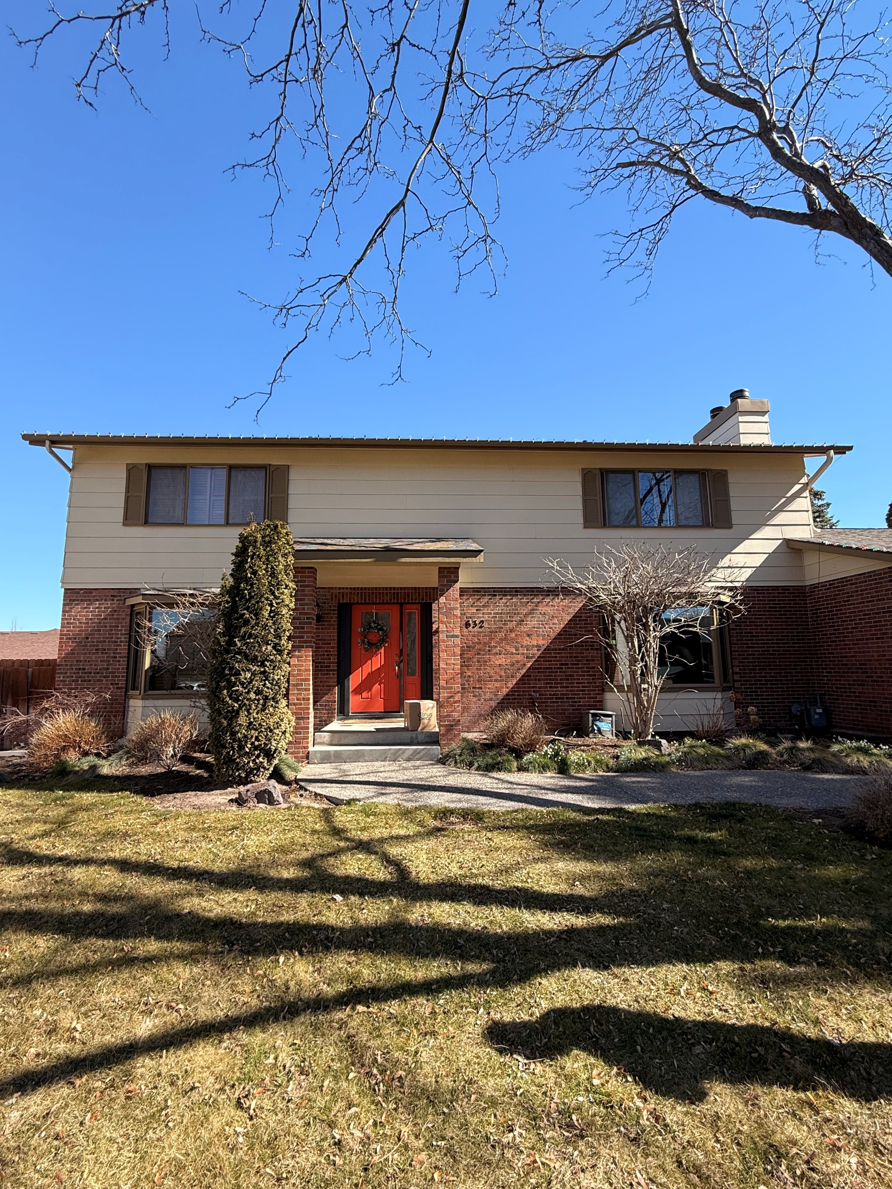 update the front of this home but do not remove the brick paint the brick white change the siding to a white board and batten replace the bay windows with a large picture window change the front door cover to be more updated with no shingled roof make the posts a wood post and had a few wood accents to match do not change the placement or structure of the home add wood shutters to the upstairs windows to match the posts make the front door a 3 4 glass style with full glass side window