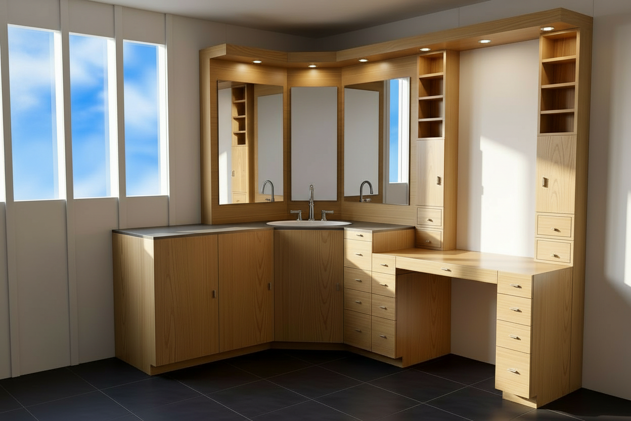 elegant light wood tone cabinets with 3 way mirror over sink mirror over makeup table