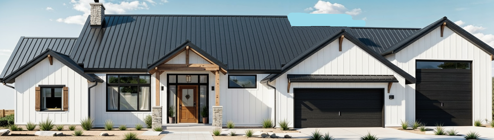 clean up make roof black and siging white and landscape dirt make garage doors black