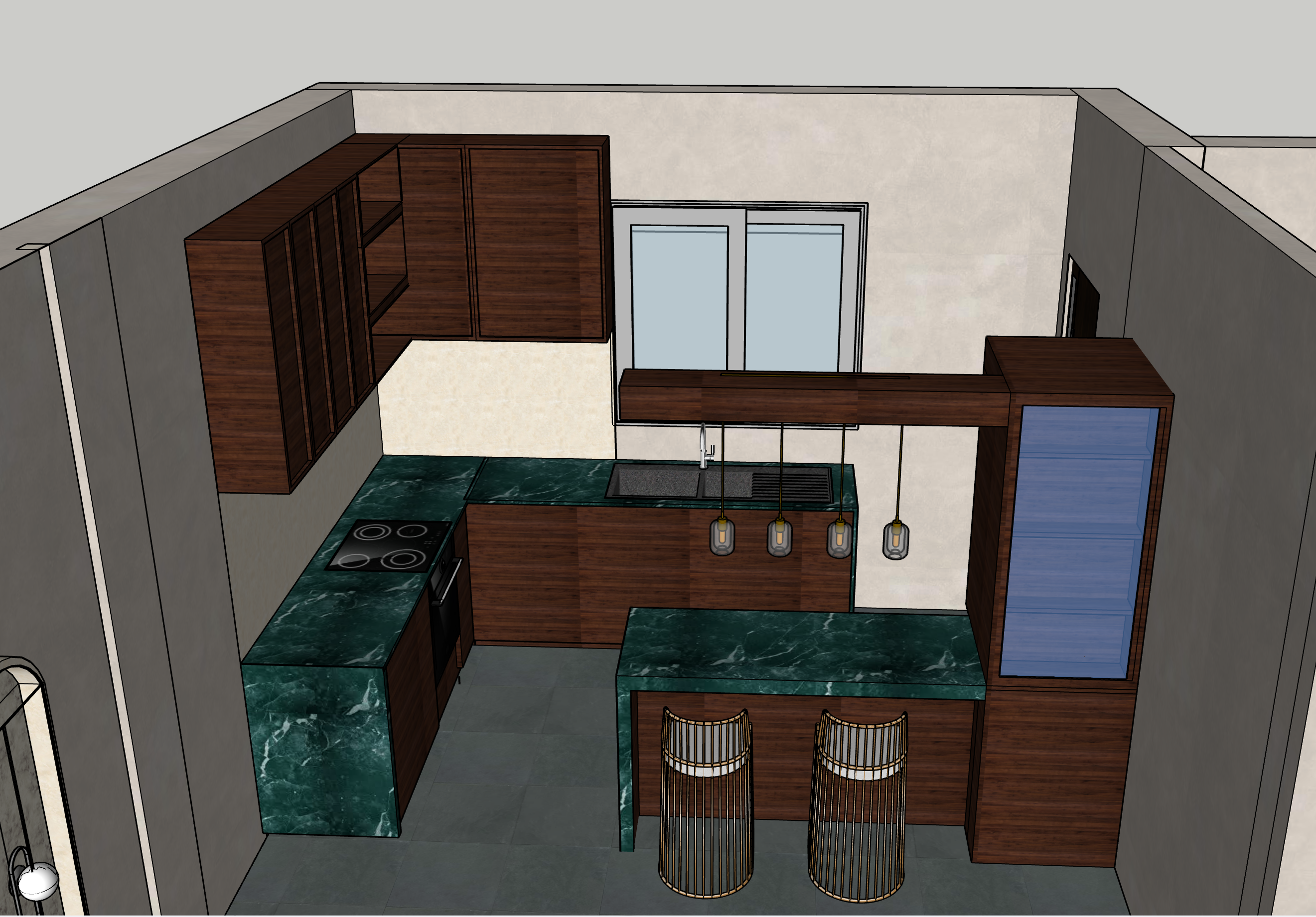 photorealistic interior render of the exact same kitchen preserve the exact composition layout camera position cabinetry design countertop shape and all materials colors dark walnut wood green marble countertop gray floor tiles do not add or remove furniture or change cabinet doors handles sink position window size or pendant arrangement improve only lighting and rendering quality add natural sunlight entering from the window soft warm morning light realistic global illumination soft shadows subtle reflections on marble and gentle ambient bounce light correct perspective vertical lines straight no distortion increase realism sharper textures cleaner edges realistic exposure and white balance high quality 4k ray traced look