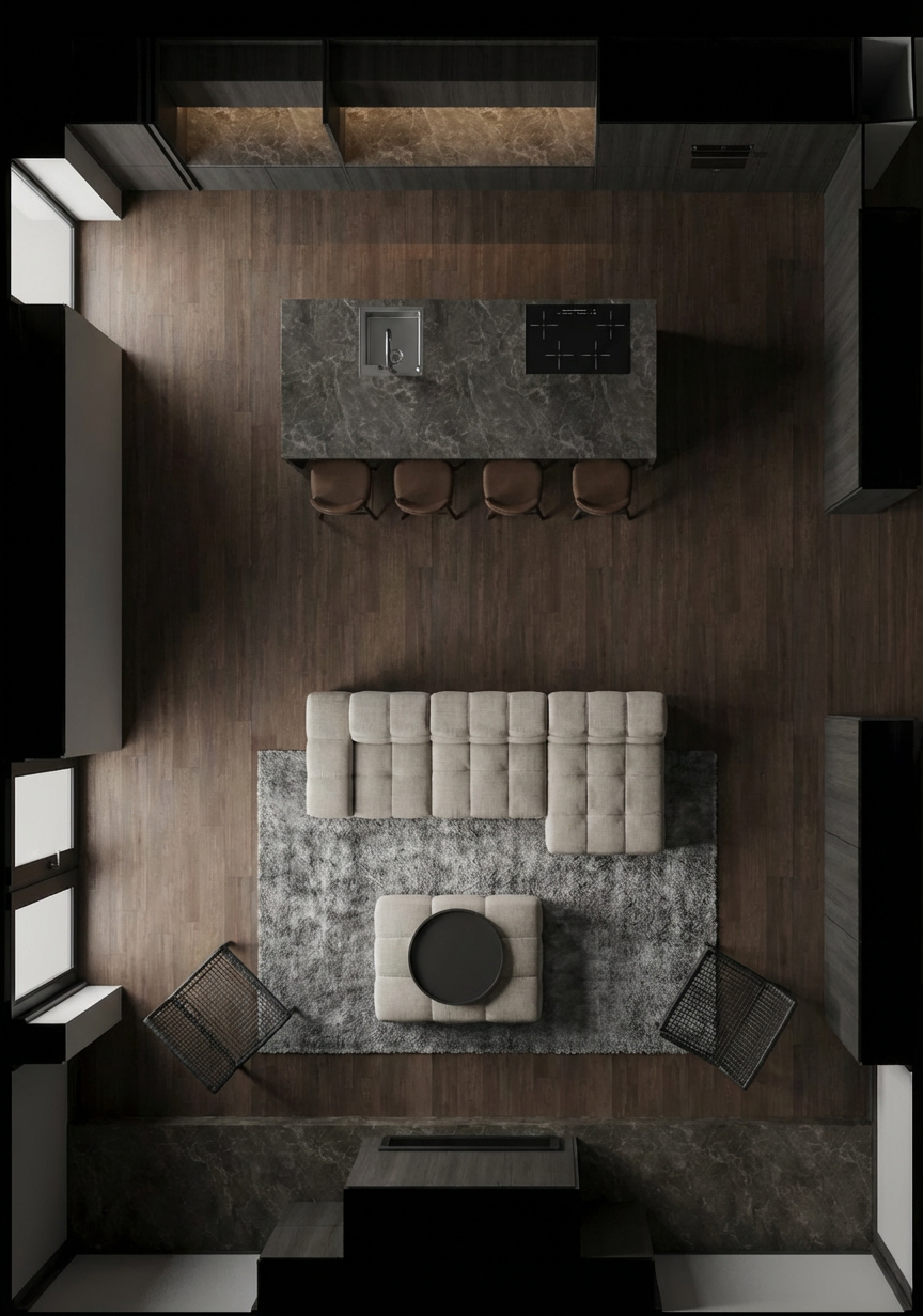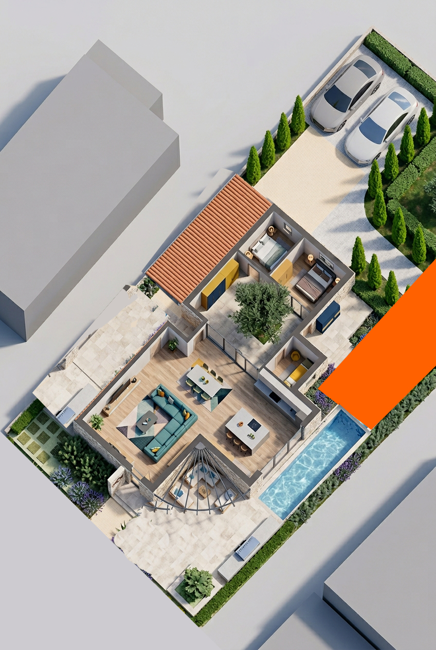 convert this floor plan into a realistic isometric 3d view of a full house show the space from an elevated angle with furniture walls and details visible try to update this isometric in place of bright orange area put mobile home around the whole garden put green hedge with solar panels on top use the same furniture as shows on the plan do not change the orientation of the floorplan