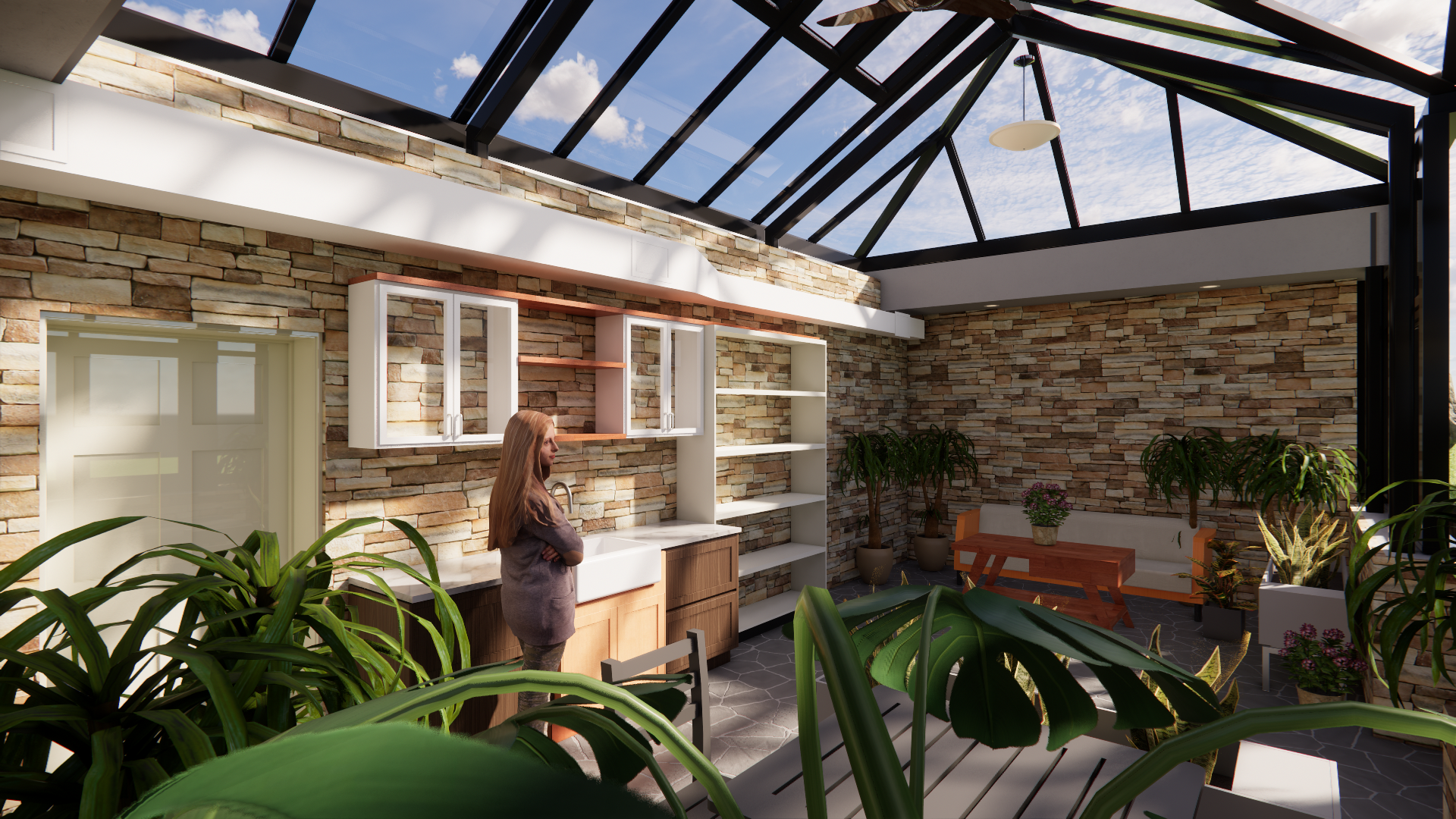 interior of a cozy modern greenhouse with stone walls complimented by green shaker cabinets and wood shelves potted plants fill the space and give it a warm inviting feeling