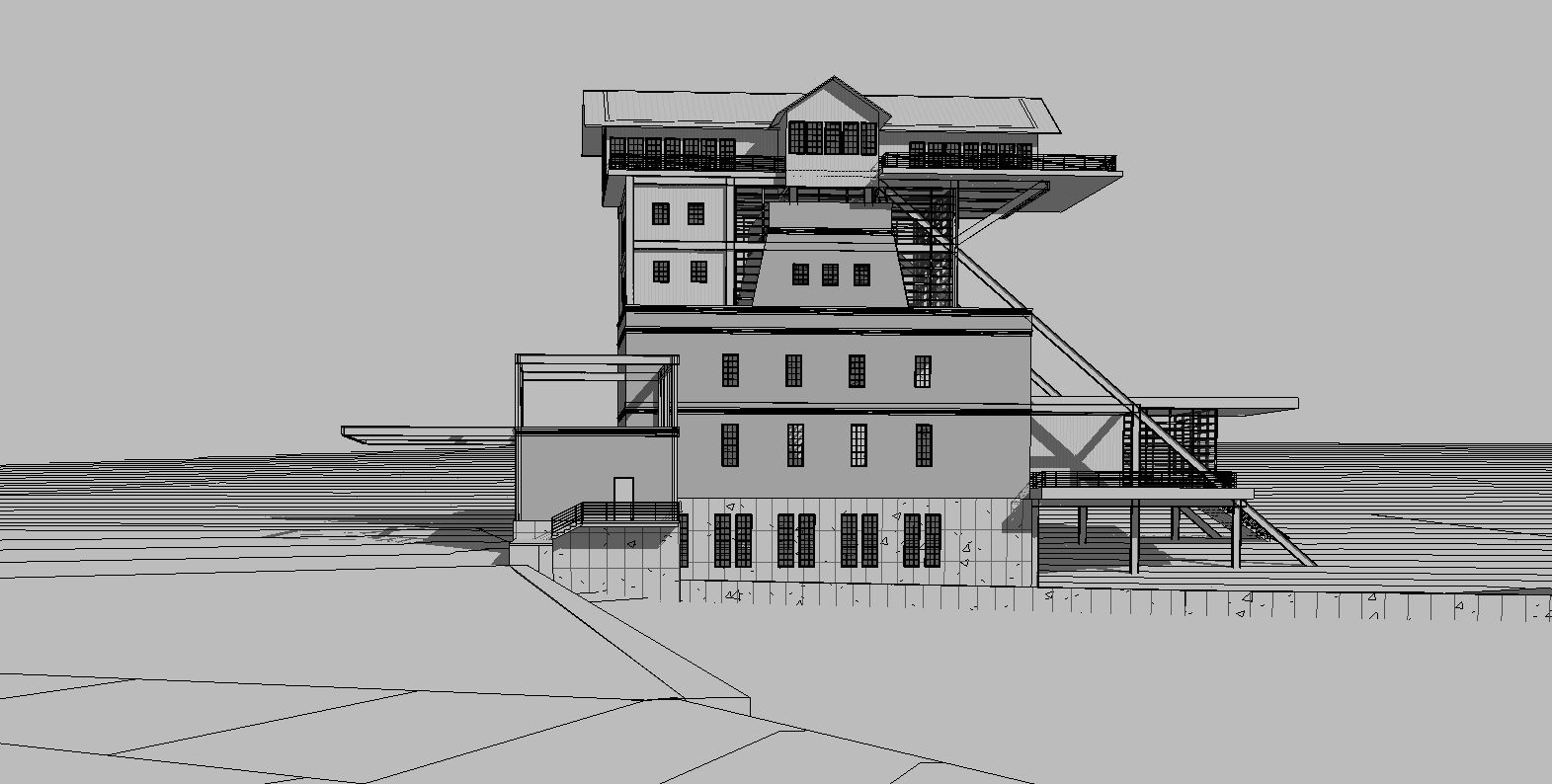 industrial building corten steel and concrete panels vertical dark shiplap river with dam foreground trees in background fog dusk soft interior lighting