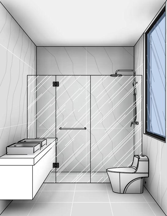 ultra realistic bathroom interior render modern minimalist design floating vanity with double sinks matte white cabinetry frameless glass shower enclosure rain shower head high quality ceramic toilet large window with natural daylight entering polished marbles stone with subtle texture on walls and floor with porcelain tile satin texture soft global illumination physically accurate reflections on glass slight ambient occlusion high dynamic range lighting balanced shadows 8k photoreal rendering leica lens clean composition crisp materials no distortion subtle reflections on floor realistic water black matt fixtures high clarity premium modern hotel bathroom style