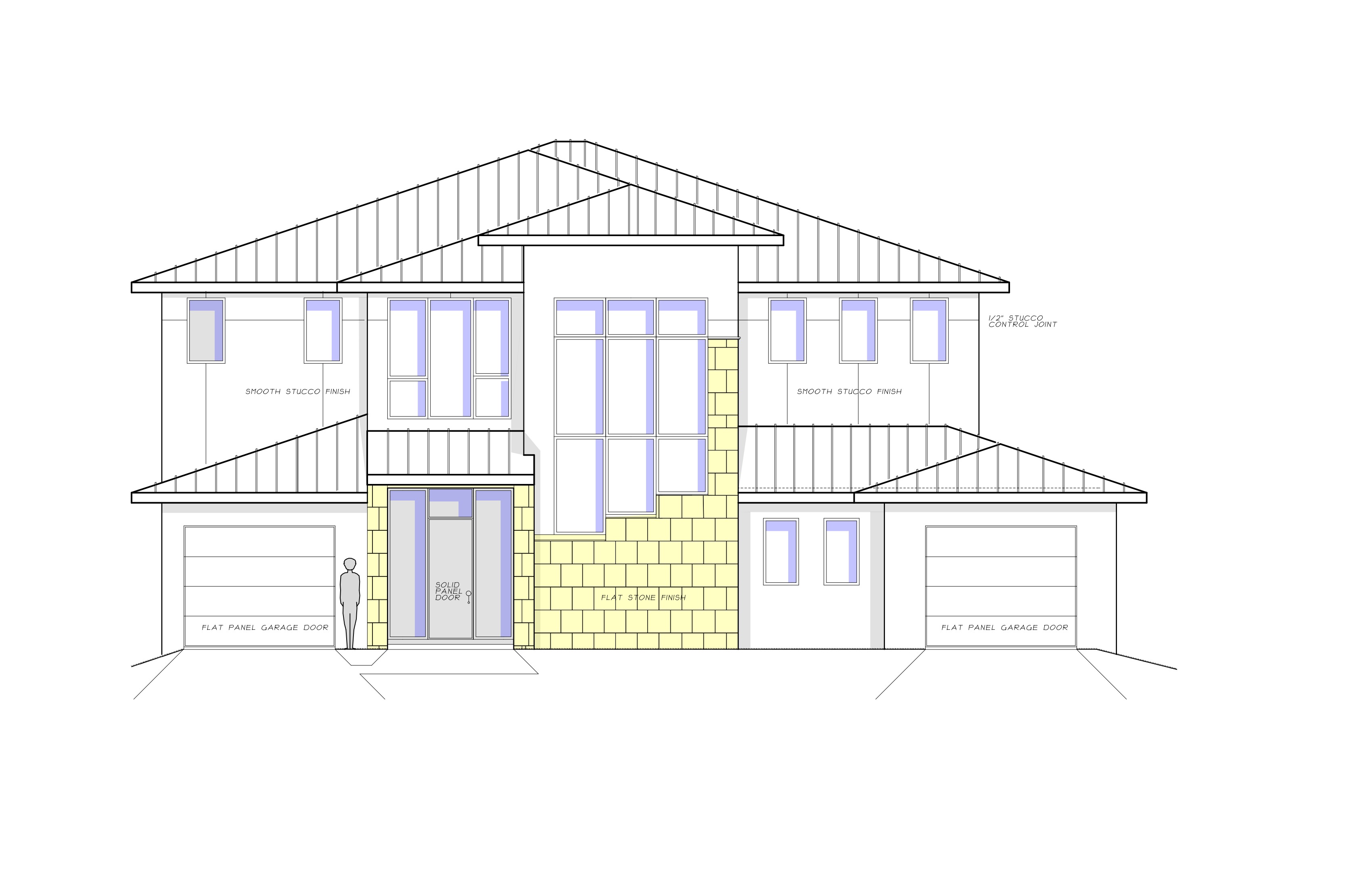 clean modern elevation dark gray 1 3 4 standing seam metal roof white fascia and soffit white window frames light gray stucco walls with thin control joints flat panel garage doors at same line as entry on each side of the home light gray stone finish white solid panel entry door with glass side lights and glass transom above tropical landscaping large light gray paver drive and walk to entry blue sky with clouds