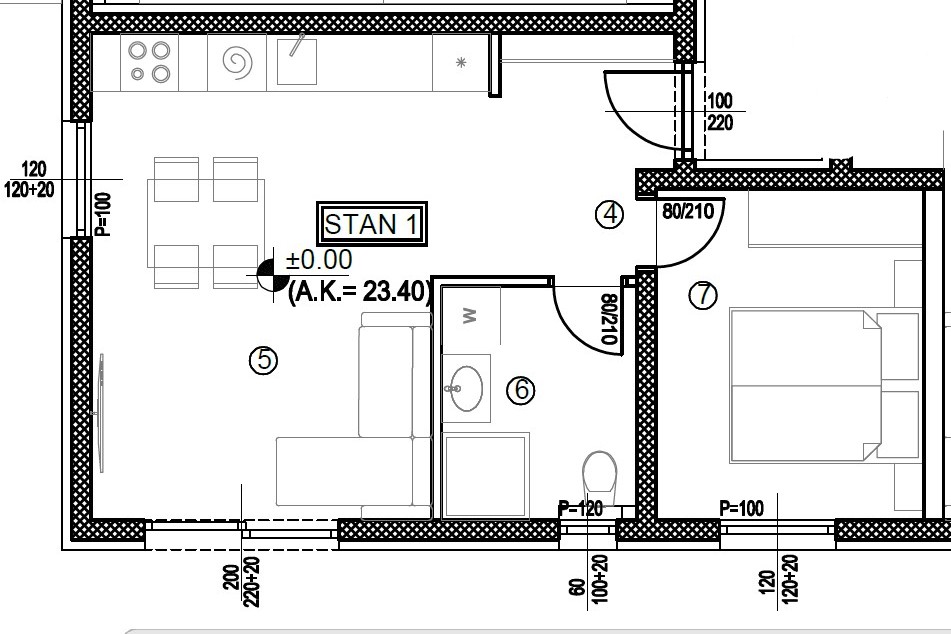 laminate floors in the entire apartment in light oak except in the bathroom and floor terrace which should be terrazzo ceramics insert all kitchen appliances and furniture according to the blueprint