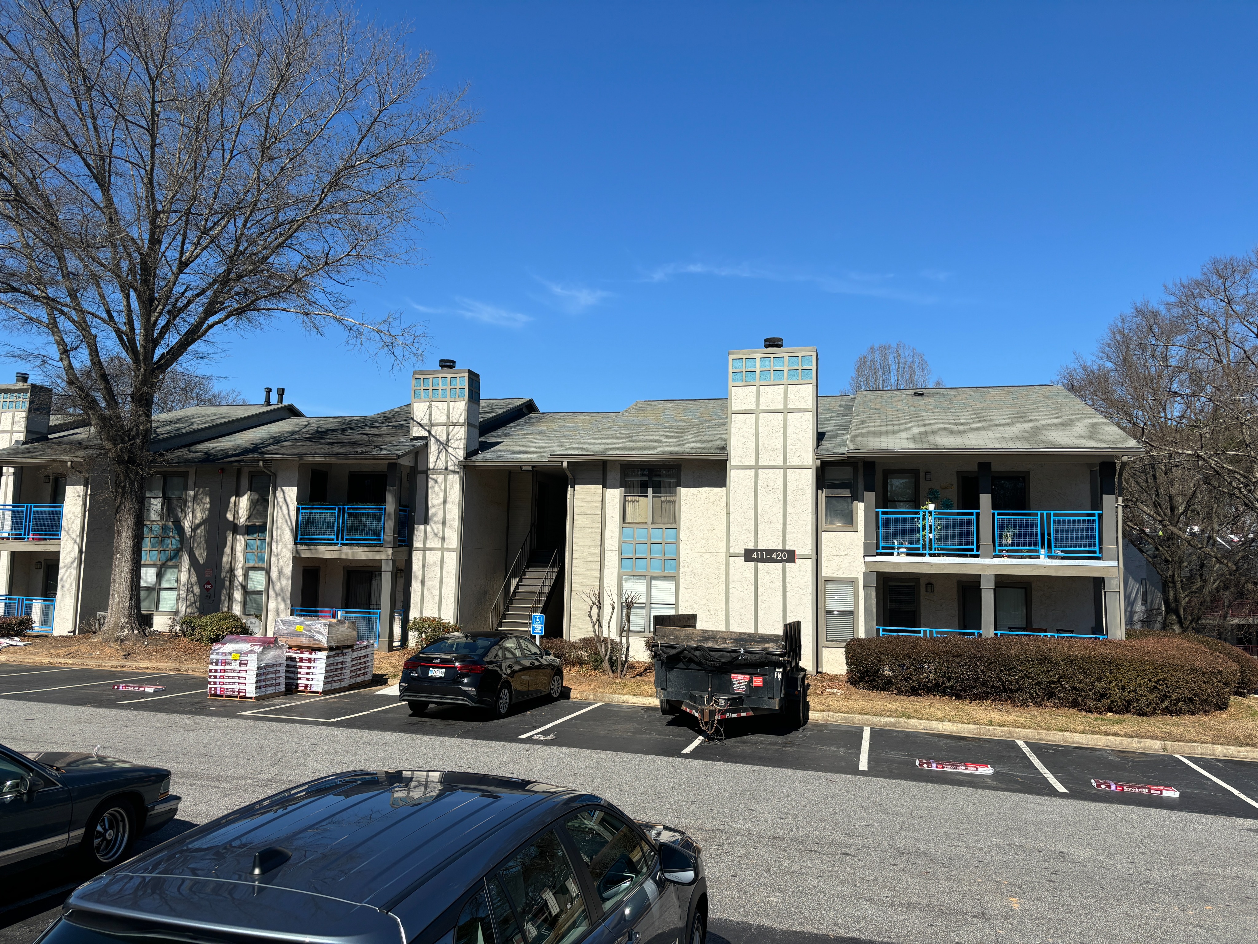 keep the building geometry the same remove cars and other items in the foreground show new asphalt paved parking lot show lush green landscaping native to atlanta ga in the summer do not change the camera view or angle show dark paint sherwin williams black magic on all exterior walls and trim show columns alabaster by sherwin williams railings color tricorn black by sherwin williams
