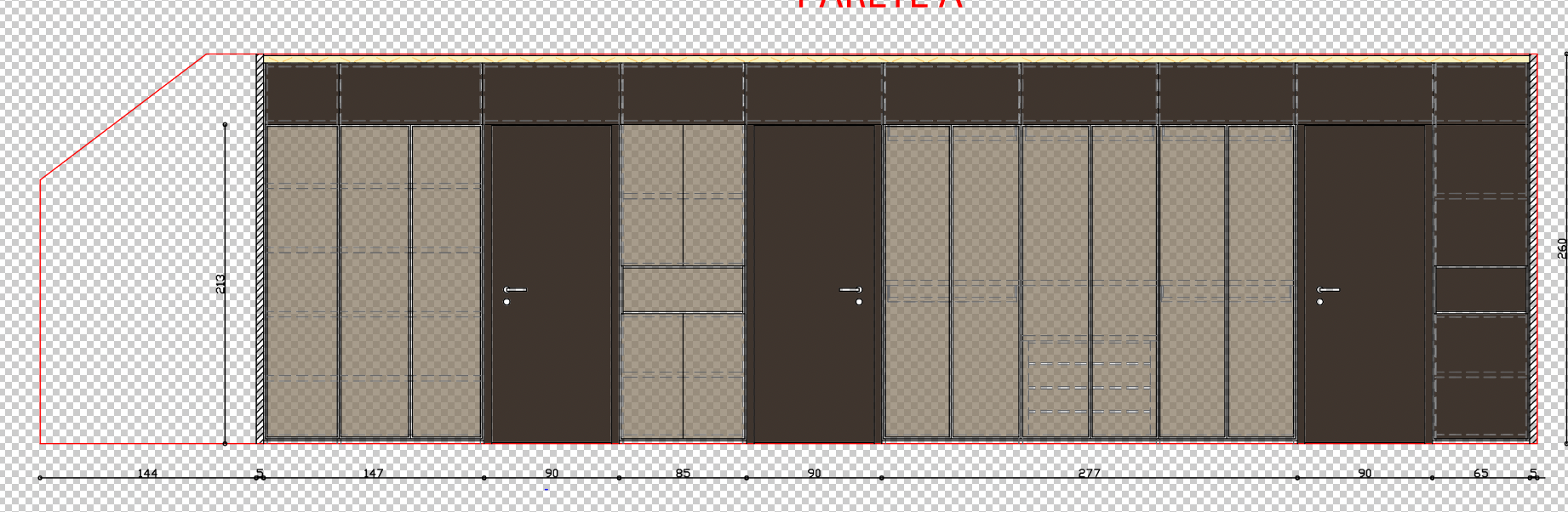 please render this elevation for me the bronze coloured doors should be made of bronze tinted stopsol glass whilst the dark brown elements should be in matt coffee coloured lacquer the yellow strip at the top is an led light for the walk in wardrobe